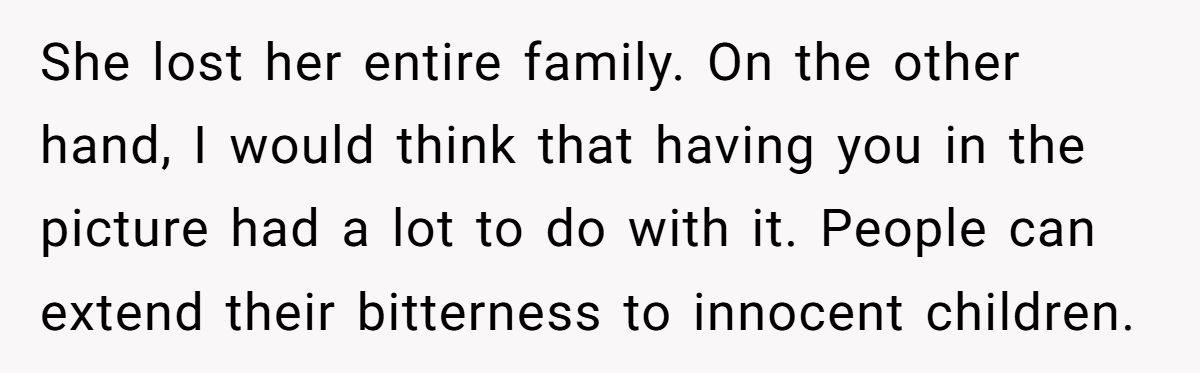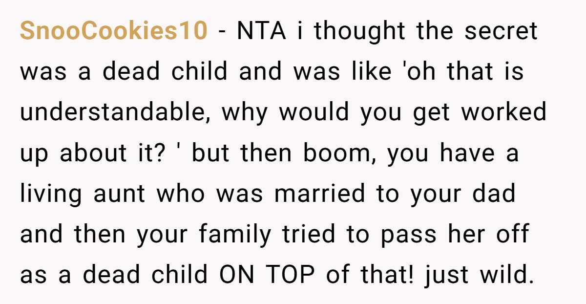 It’s understandable that the Redditor feels betrayed not only by their parents but by their grandparents, who actively participated in erasing a woman from the family narrative. The lie about a cot death adds another layer of cruelty, especially considering that the aunt is still alive somewhere, likely carrying her own trauma.