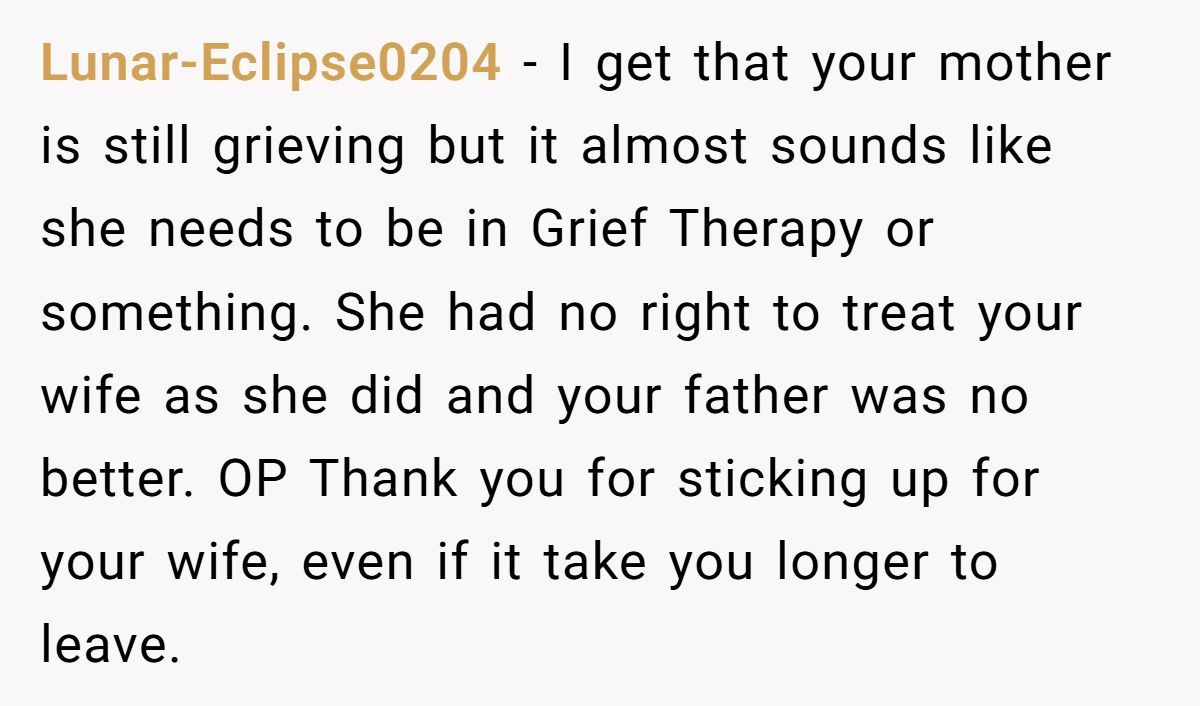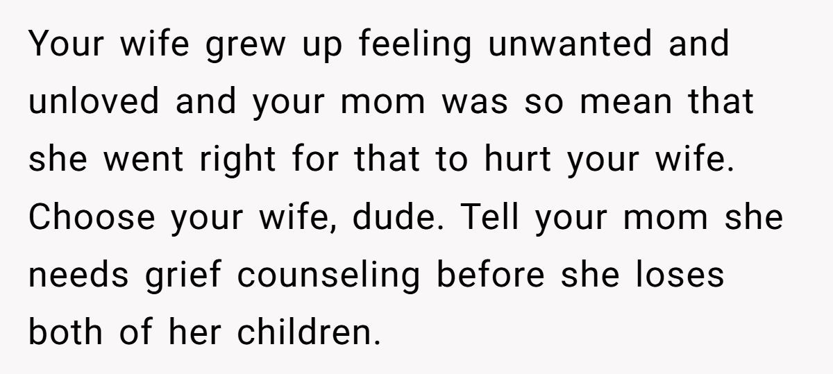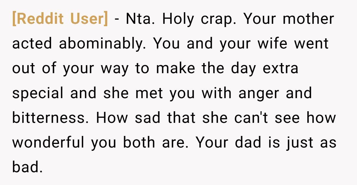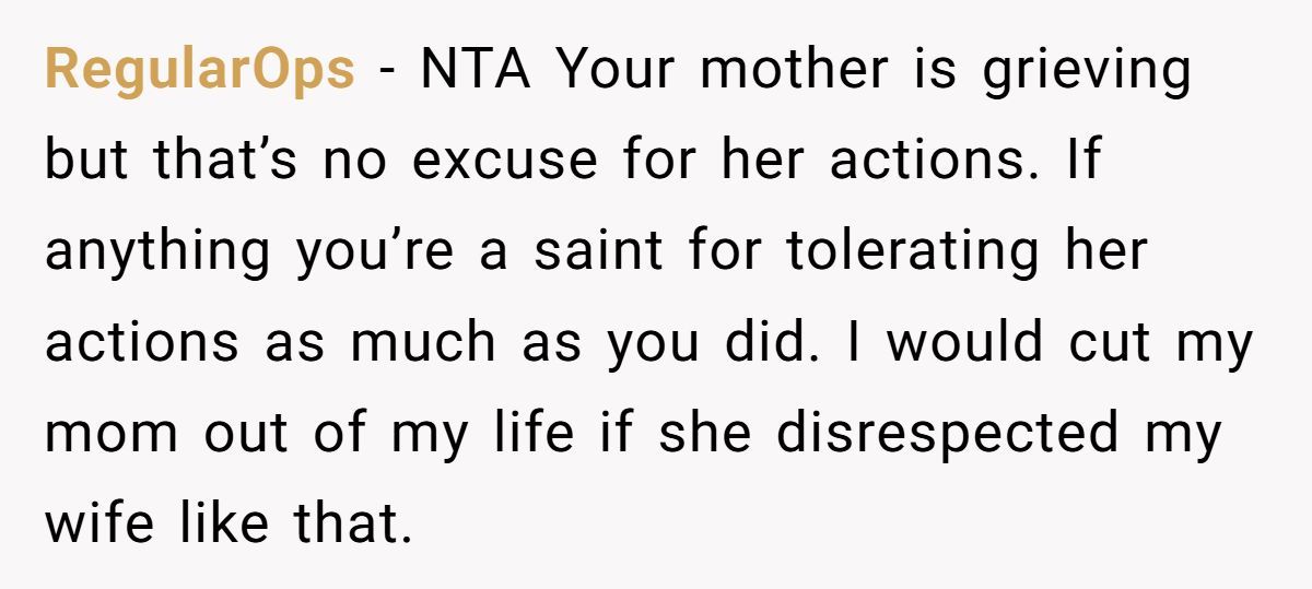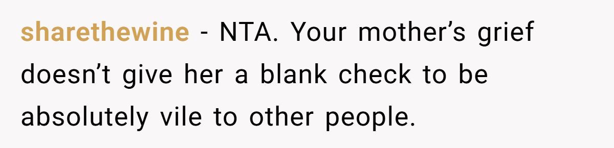 Redditors overwhelmingly sided with the son, labeling him “NTA” (Not The Asshole), and many pointed out that grief does not grant permission to abuse others. One top commenter wrote, “She doesn’t get to shatter someone else just because she’s broken too.” Another added, “Your wife showed more grace and love in one afternoon than your mom did all year.”