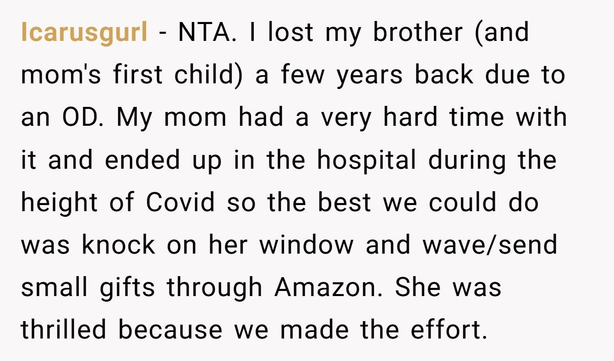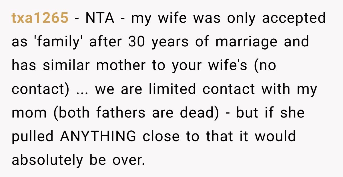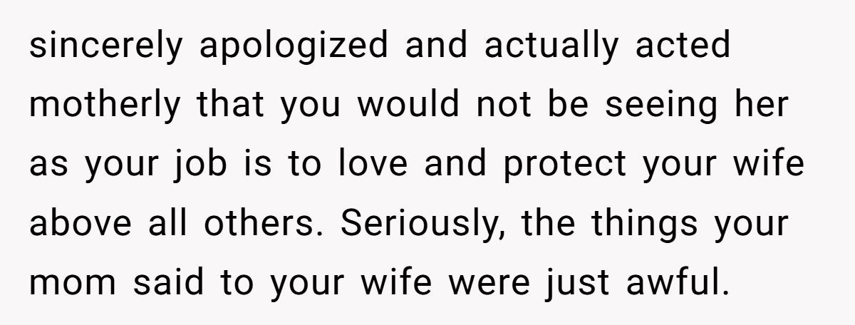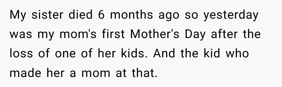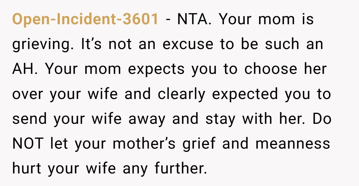 Redditors overwhelmingly sided with the son, labeling him “NTA” (Not The Asshole), and many pointed out that grief does not grant permission to abuse others. One top commenter wrote, “She doesn’t get to shatter someone else just because she’s broken too.” Another added, “Your wife showed more grace and love in one afternoon than your mom did all year.”