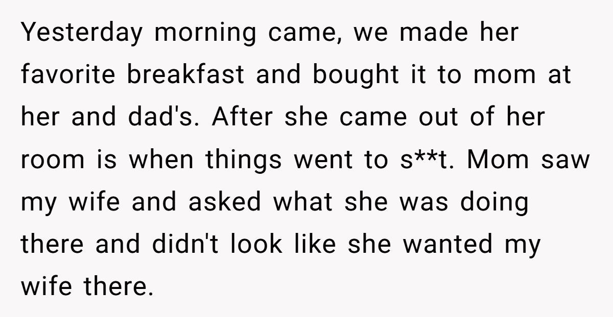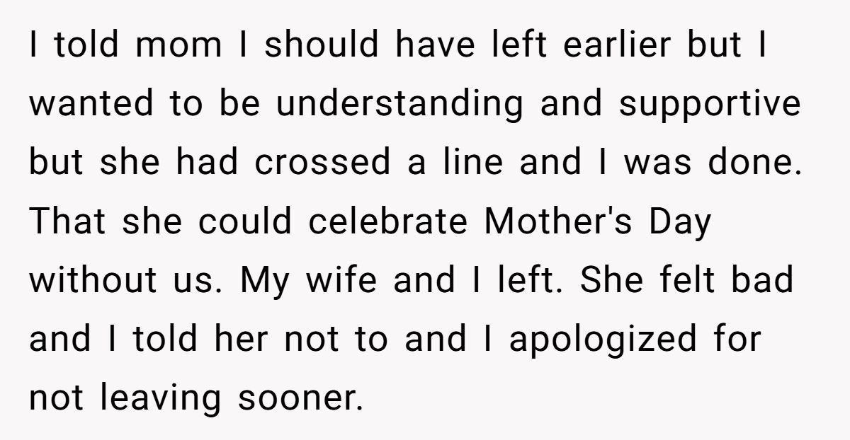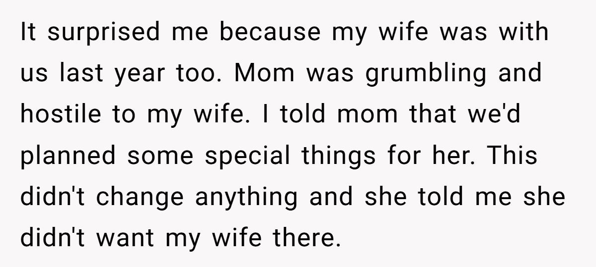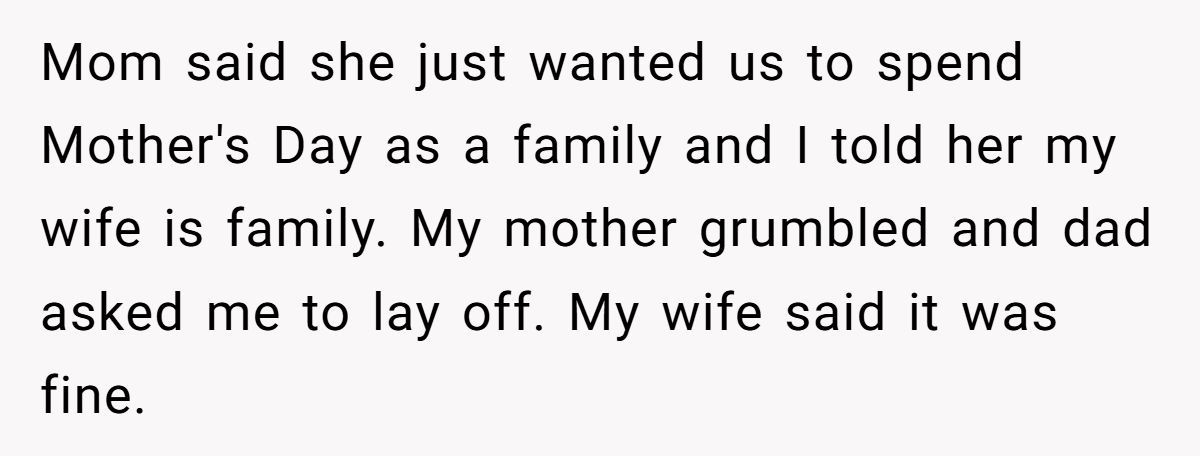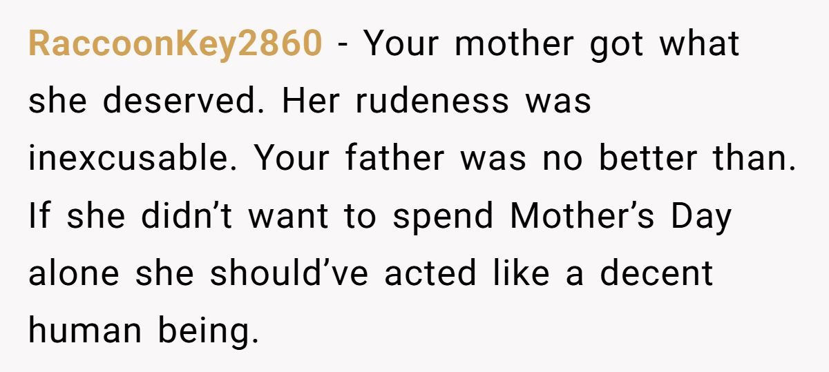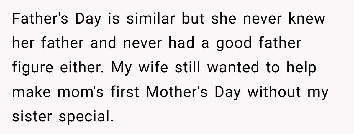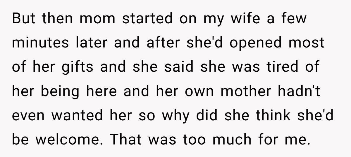 She went further, accusing the young woman of “forcing herself into someone else’s Mother’s Day,” calling her a “reminder” that some people don’t deserve to celebrate. Then came the lowest blow: a snide comment about the wife’s estranged, emotionally abusive mother, something the family knew was a deep source of pain.