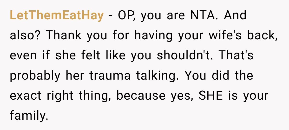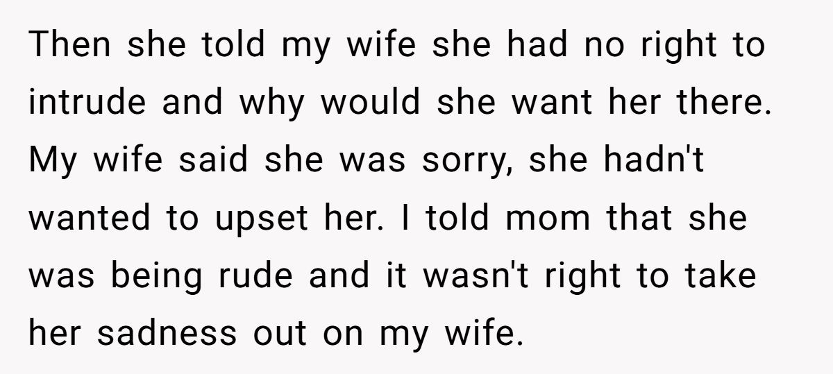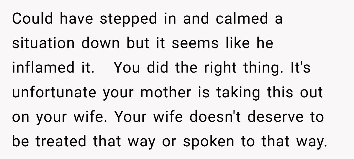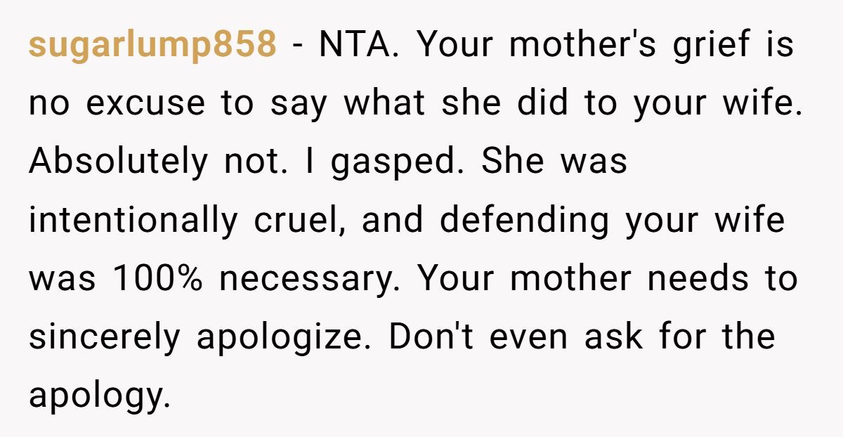Many commenters agreed: the husband did the right thing by standing up for his wife, especially since his grieving mother used her pain as an excuse to lash out and deliberately hurt her.