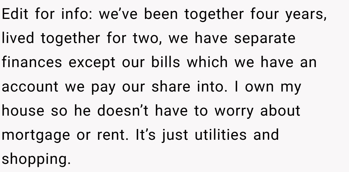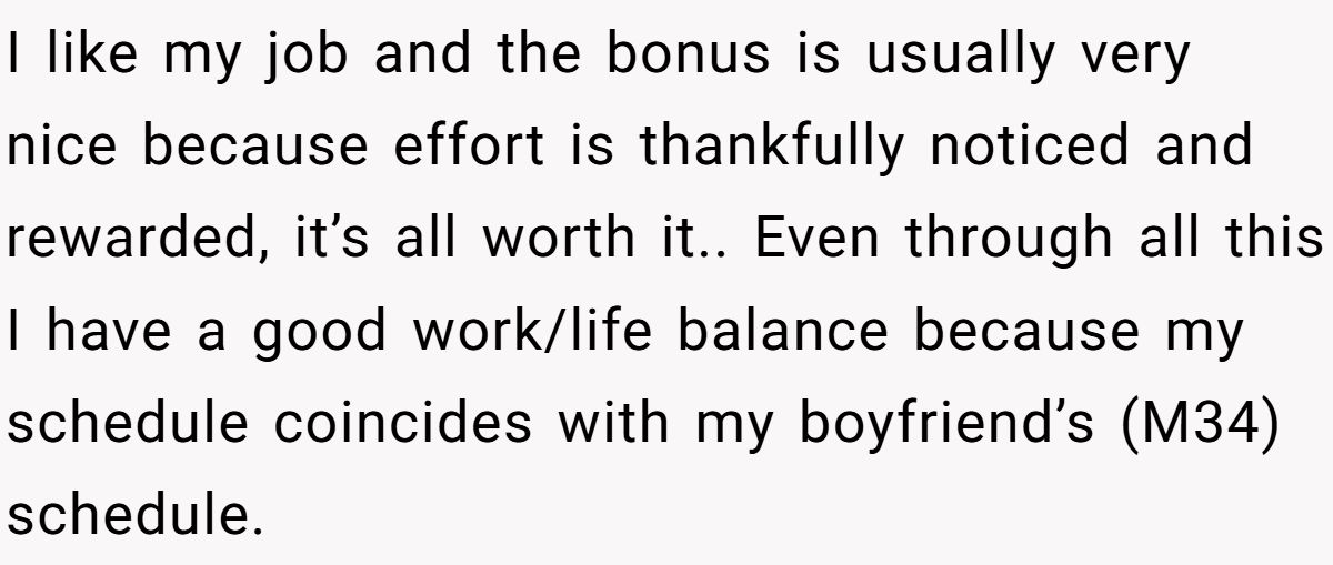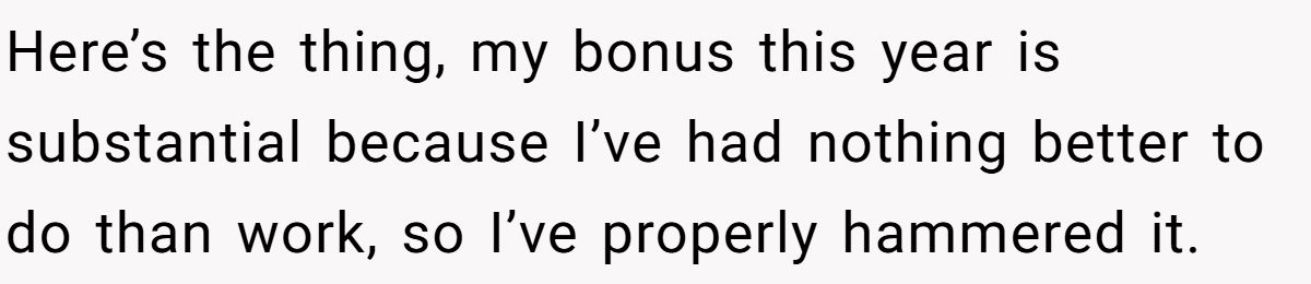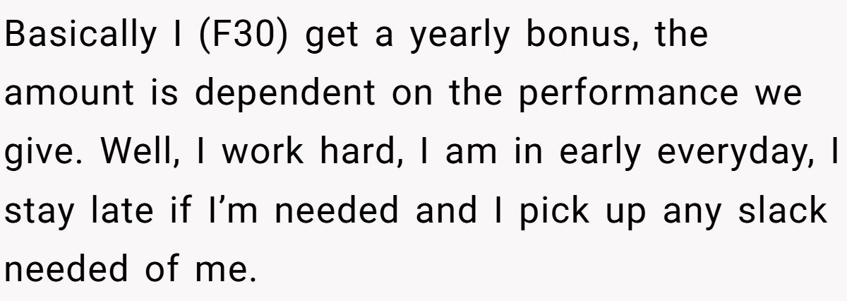 This 30-year-old Redditor, let’s call her Bonus Boss, works hard, stays late, and picks up slack, earning a hefty bonus that reflects her hustle. Living with her boyfriend of four years, she covers most of their bills, utilities, and groceries, since she earns more and owns their home outright.