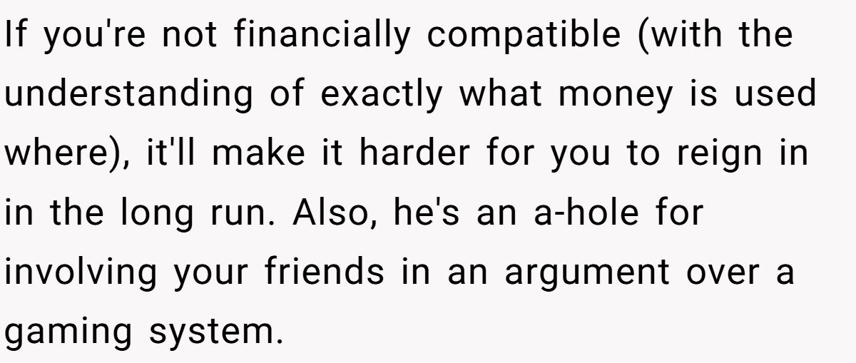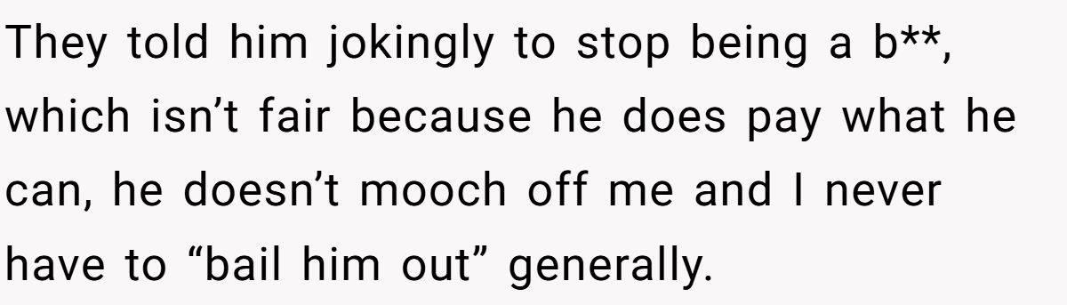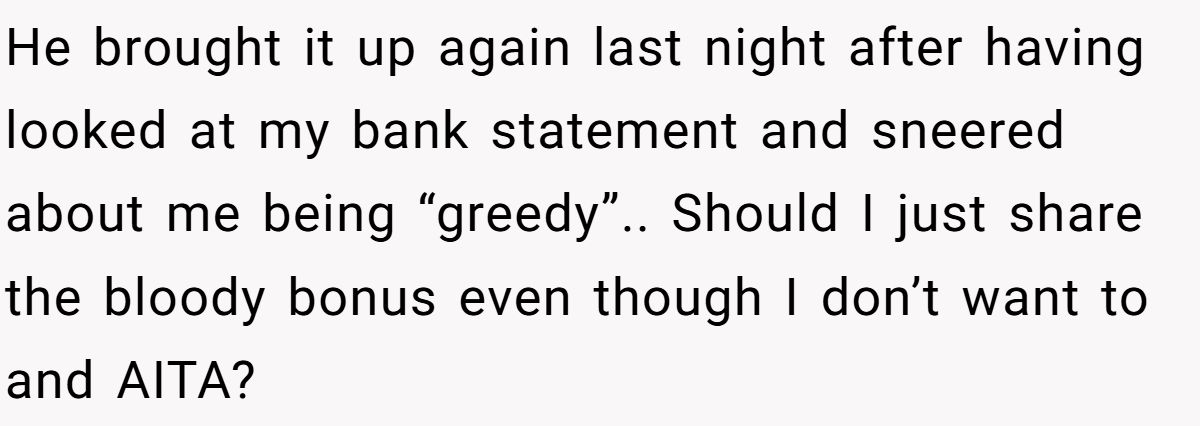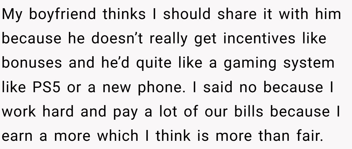 From the boyfriend’s perspective, he might feel left out of her financial wins, especially since he doesn’t get bonuses in his job. His comments about sharing suggest he sees their partnership as a 50/50 deal, even if their contributions aren’t equal. But airing their spat to friends and calling her “greedy” crosses a line, especially since he’s not struggling financially.