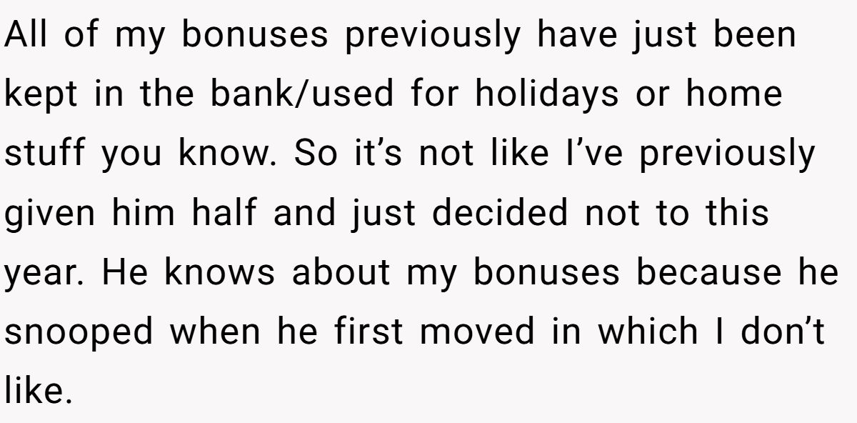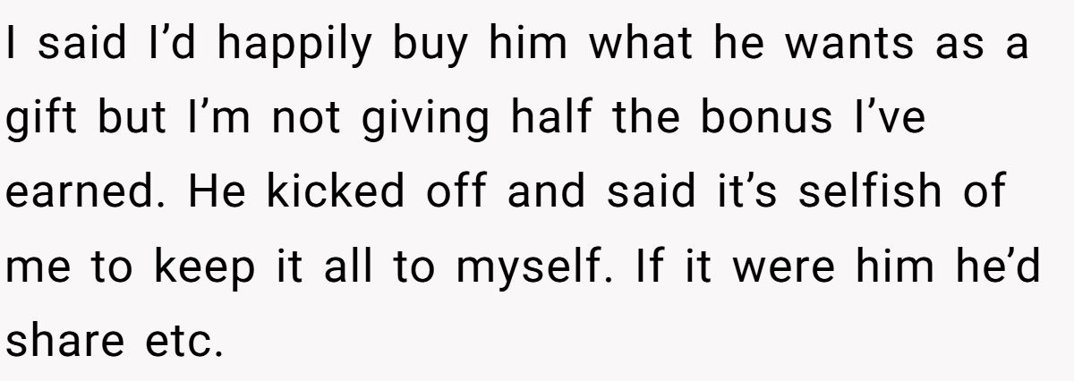 Her refusal to split her bonus, earned through her own sweat and long hours, feels fair to her, especially since she offered to buy him a gift. But his insistence, plus snooping in her bank statements, has turned this into a trust issue as much as a money one.