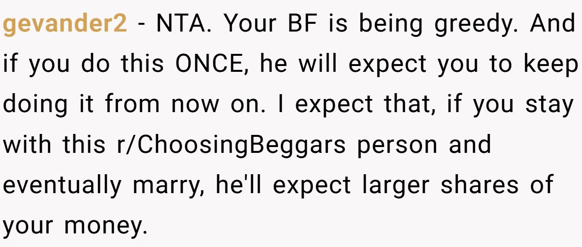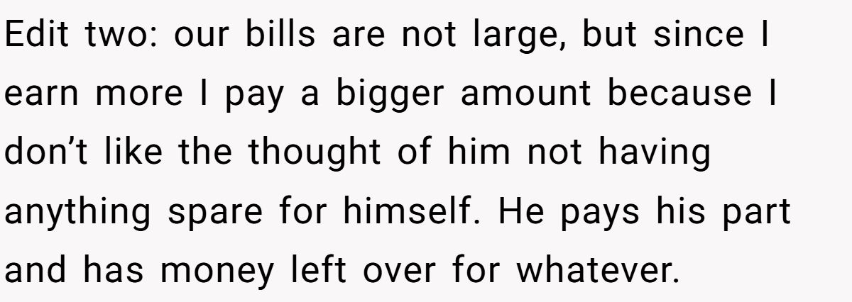 A 2023 study from the Pew Research Center found that 41 percent of couples report money-related disagreements as a top relationship stressor, particularly when one partner earns significantly more. Bonus Boss’s setup, paying more to ensure her boyfriend’s comfort, already shows generosity, making his demands feel entitled.