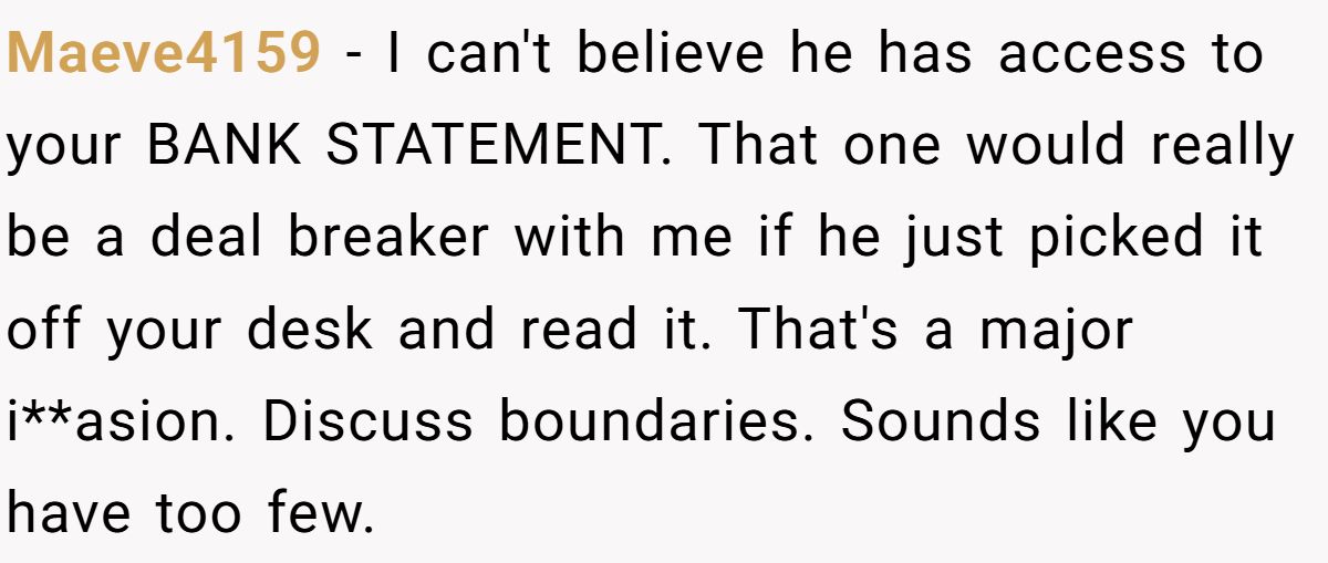 Setting clearer boundaries, like locking down bank statements, could prevent future snooping. The boyfriend needs to respect her autonomy and appreciate her contributions, or this could signal deeper issues in their relationship.