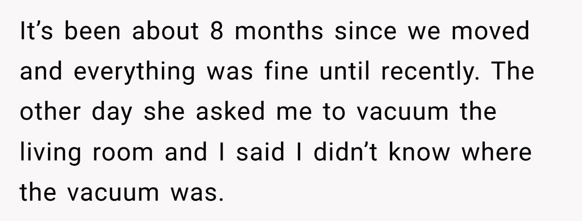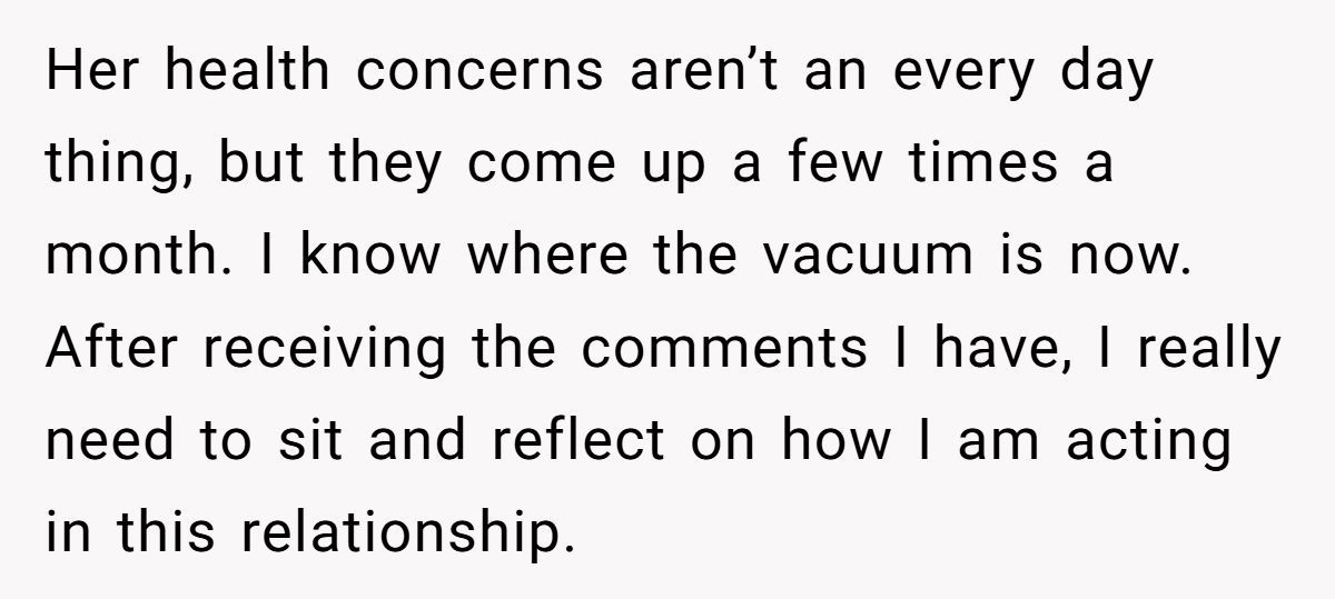 Many also felt your attitude came off as dismissive, especially saying you “let” her do more. And honestly… how hard is it to find a vacuum?