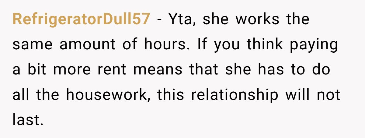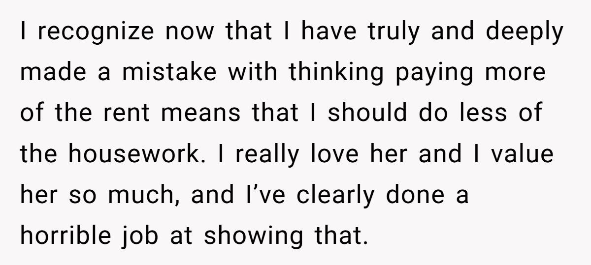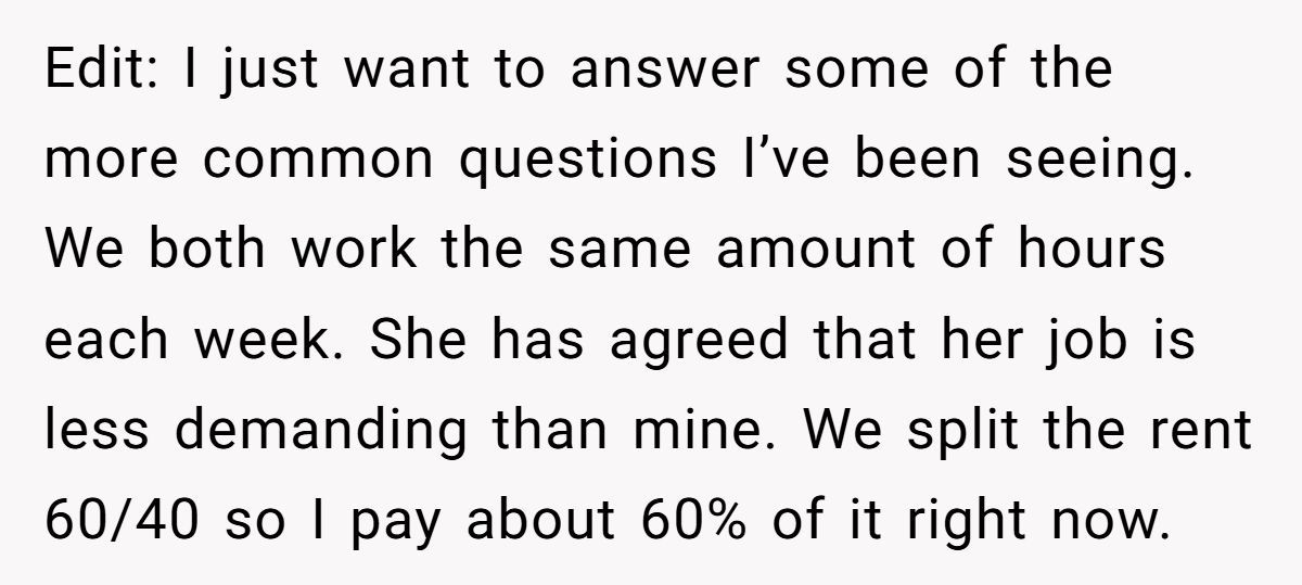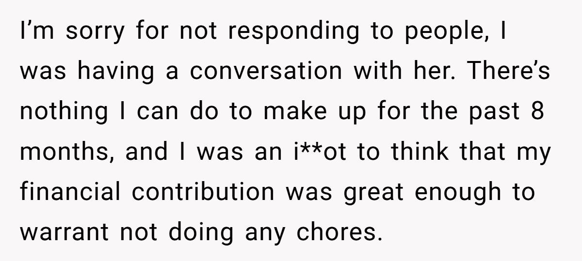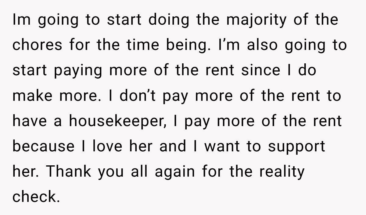 To his credit, the Redditor later updated the post saying he realized he was wrong. He’s agreed to help more with chores and cover more of the rent. That’s a step in the right direction but after eight months of imbalance, trust needs rebuilding, not just promises.