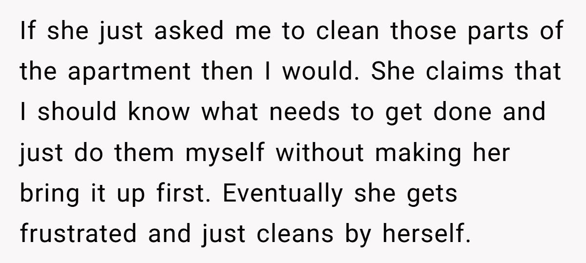 Her solution? A silent chore protest. His reaction? Annoyance and confusion. He insists that his job is more demanding, and since he pays more in rent, he shouldn’t have to scrub as much. But is that how partnership works?
