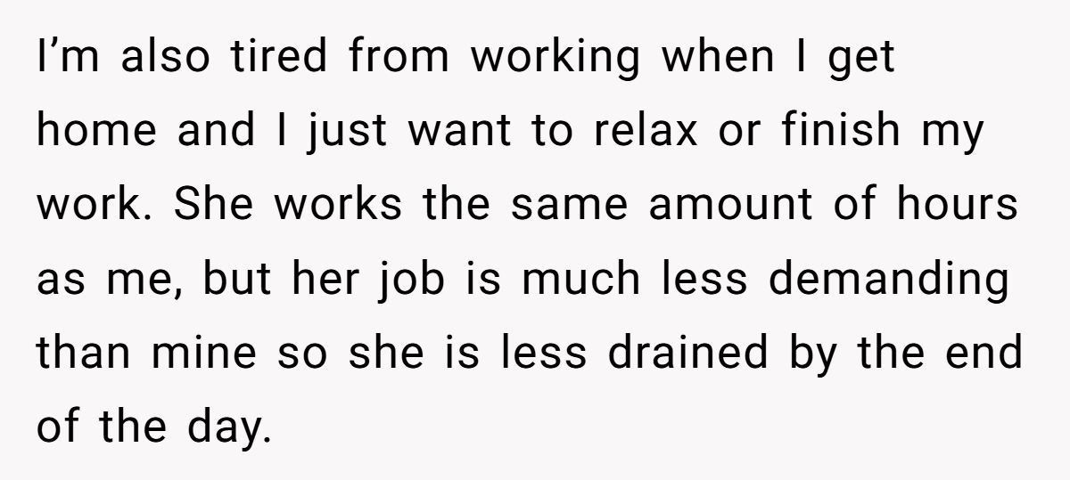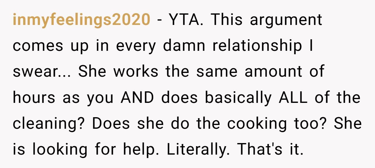 Commenters say: YTA. They pointed out that your partner works just as many hours, likely handles most of the chores, and may be burnt out.