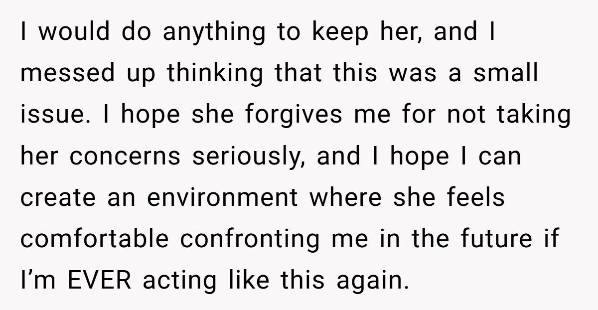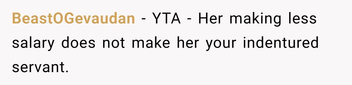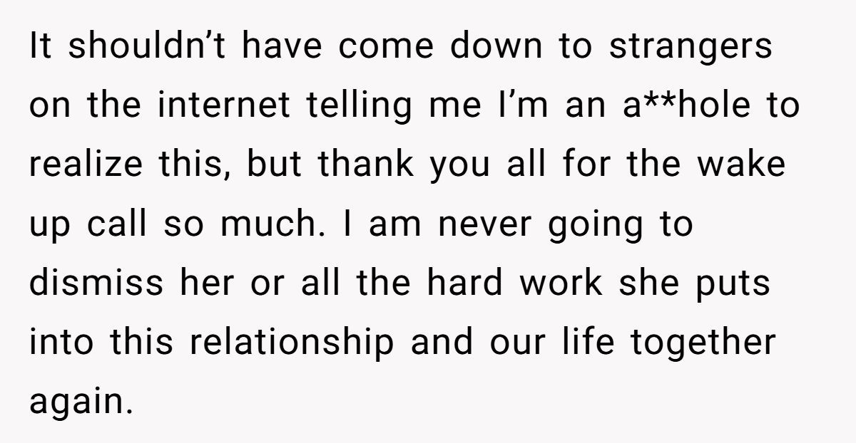 This Redditor’s “I pay more, so I clean less” logic left his relationship as messy as his bathroom floor. His girlfriend didn’t just need help vacuuming, she needed to feel like an equal partner. While his recent shift in attitude is promising, trust and balance don’t come from a single apology, they come from ongoing effort.