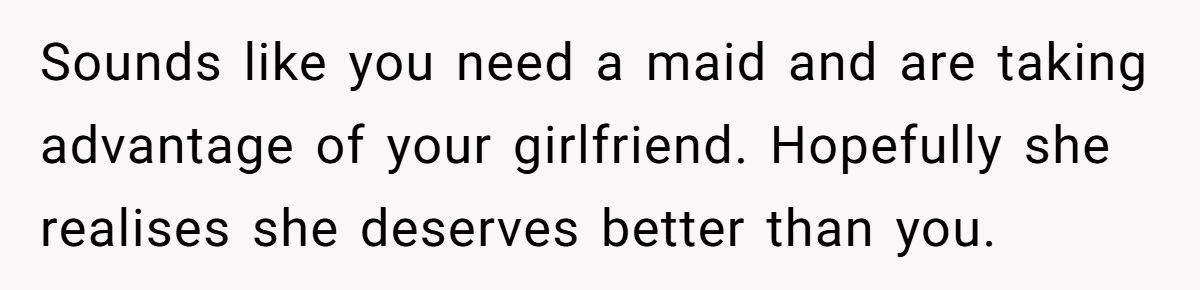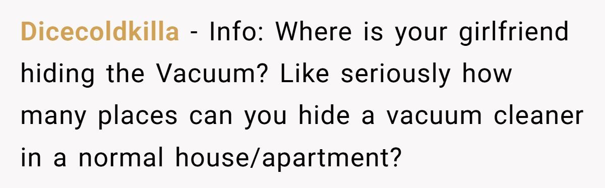 This Redditor’s home life is a case study in imbalance. He says his girlfriend works the same hours as him, pays 40% of the rent, buys most of the groceries and still handles nearly all the household chores. His contribution? “Sometimes” doing the dishes. When she asked where the vacuum was, his cluelessness became the last straw.