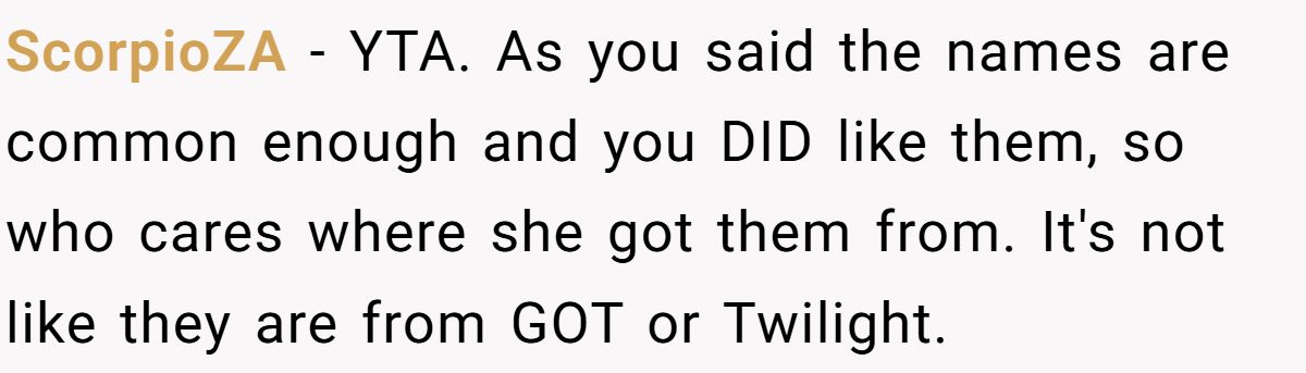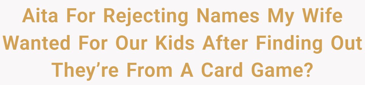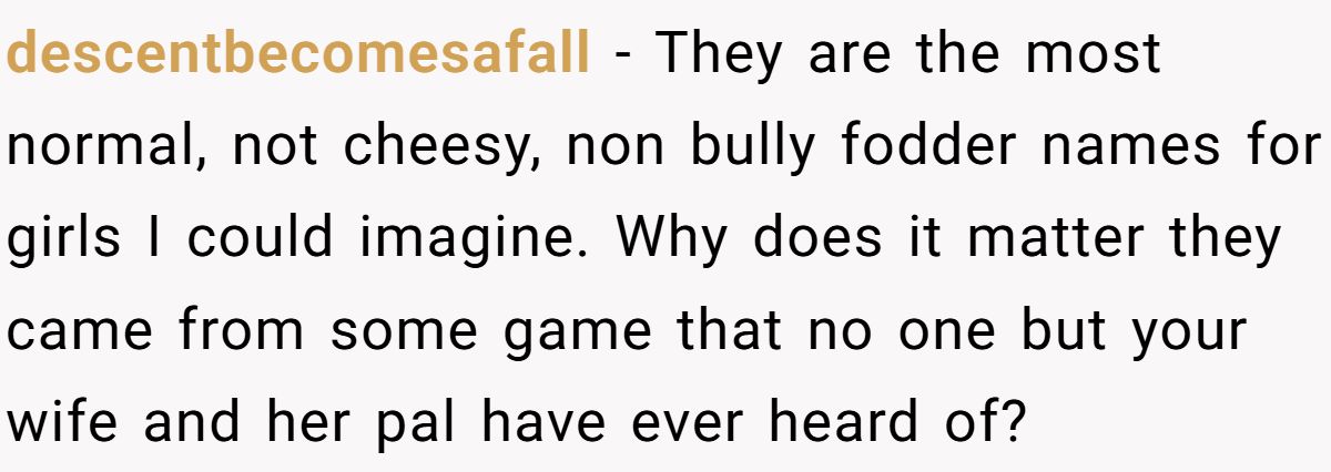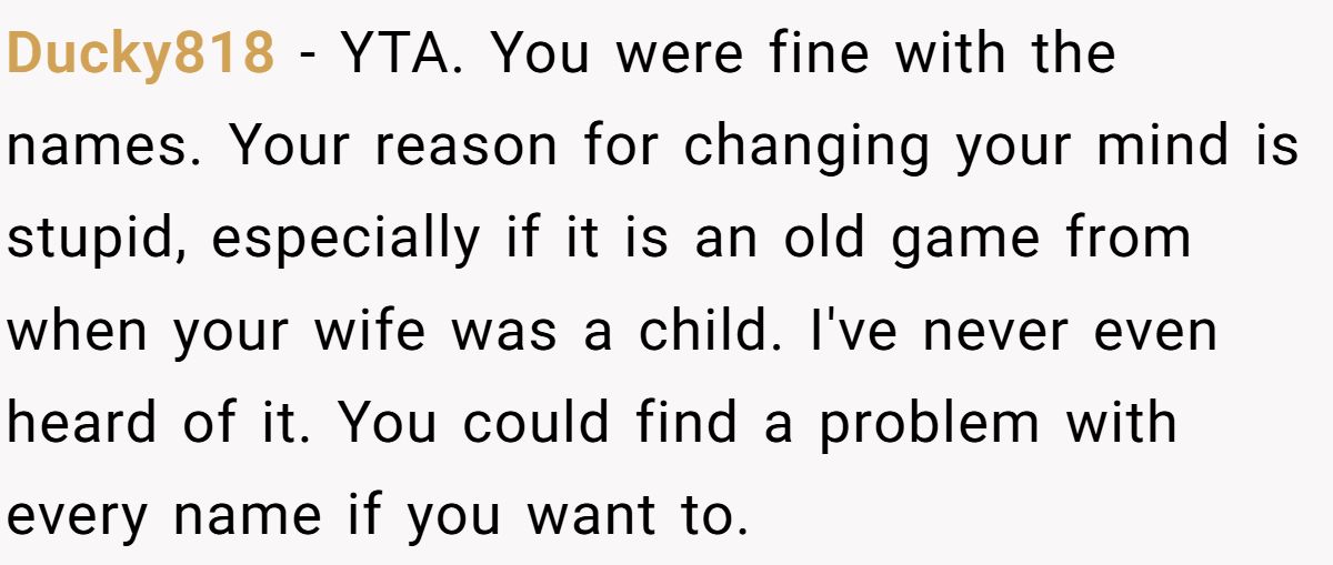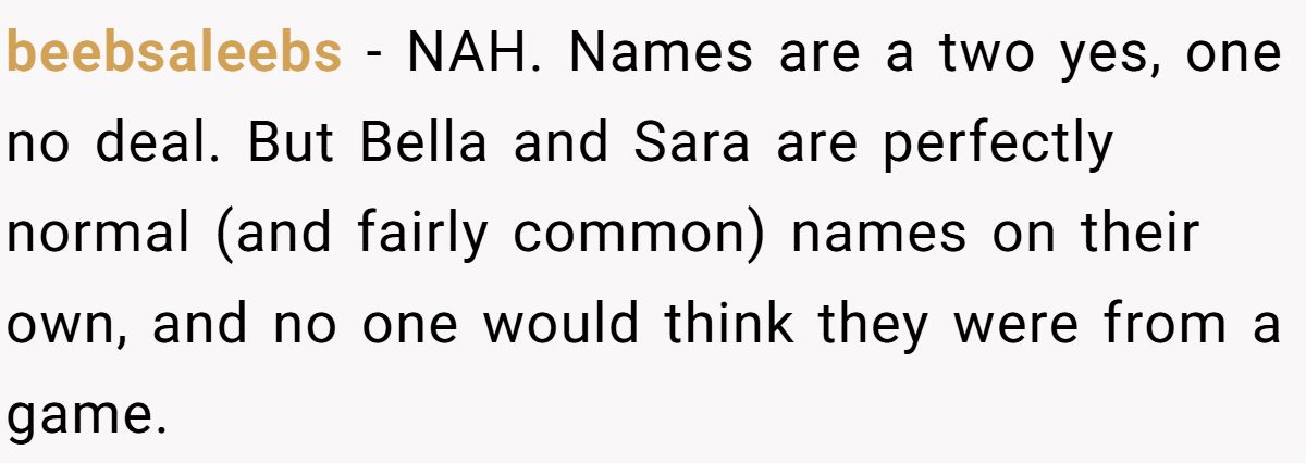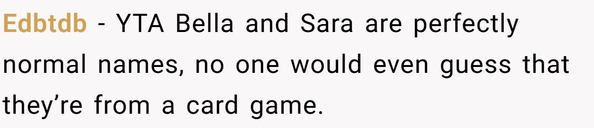 Reddit was nearly unanimous: YTA. Most felt Bella and Sara are normal names, and the card game origin shouldn’t matter if he liked them already. A few suggested compromise, but many said he overreacted and made his wife feel bad for no good reason.