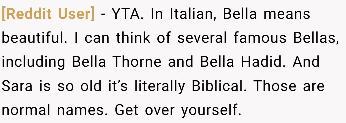 Turns out, most Redditors think the husband’s reaction was way over the top. To them, Bella and Sara are as classic as baby names come, hardly niche or “cheesy.”