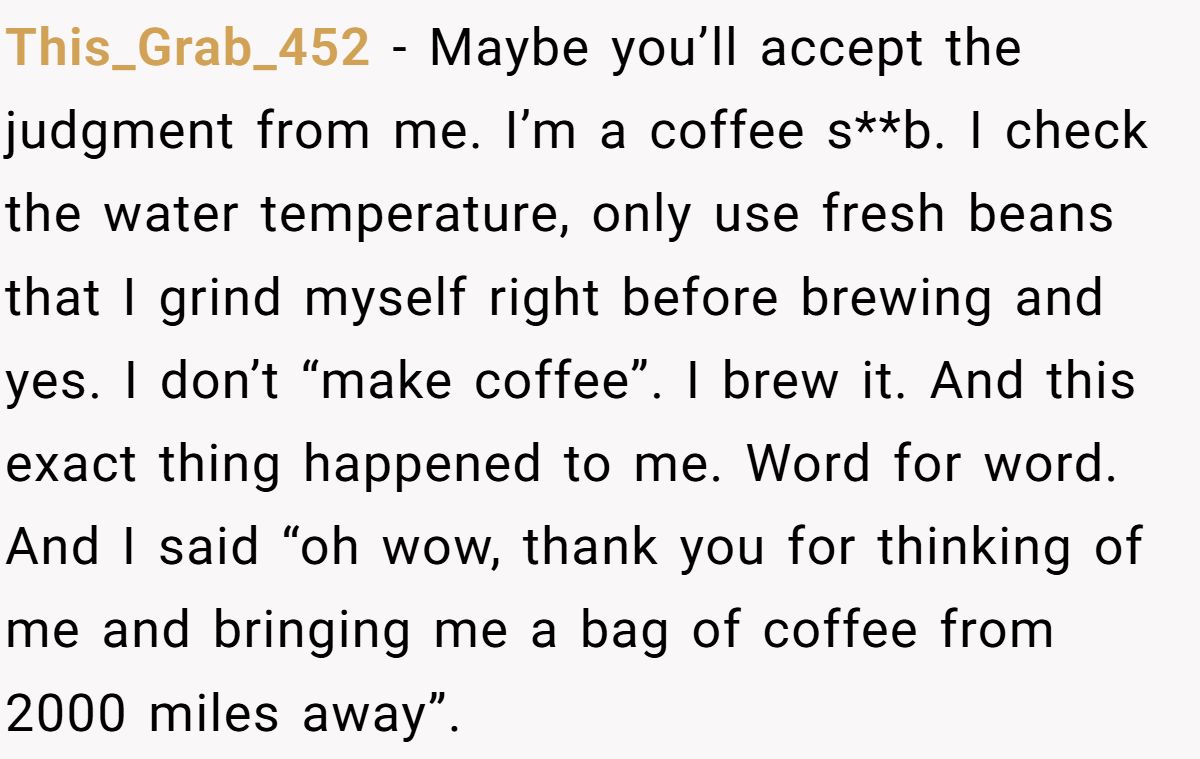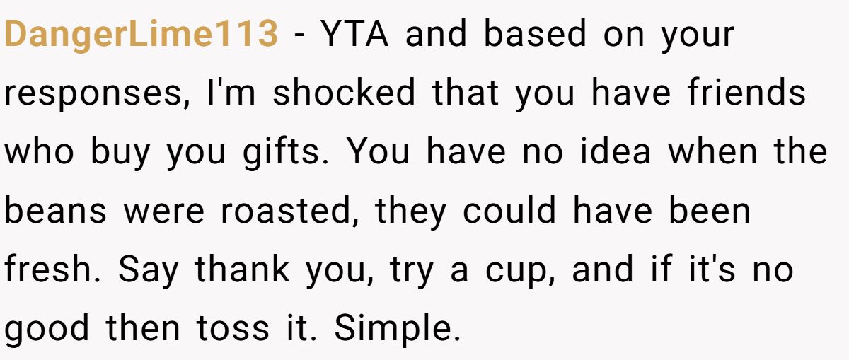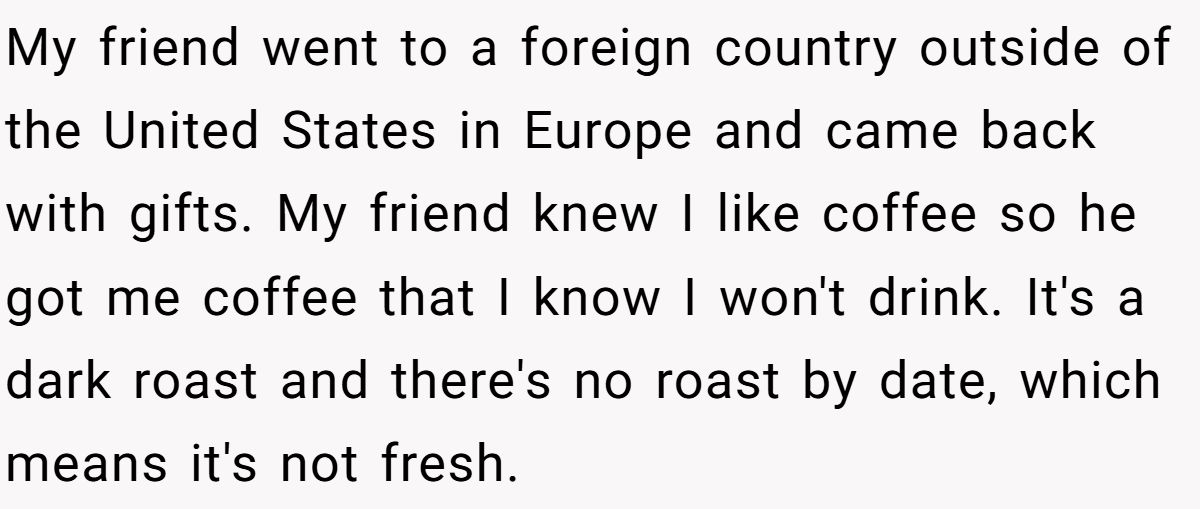 One Redditor did the former, turning down a bag of dark roast brought back from Europe by a friend. His reason? No roast date, not his style. His friend’s reaction? Let’s just say it wasn’t exactly warm and fuzzy. What started as a thoughtful gesture turned into an awkward rift, and now he’s wondering if being honest made him the jerk. Get ready to dive into this roasted drama.