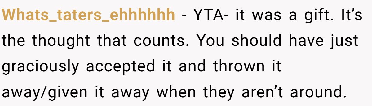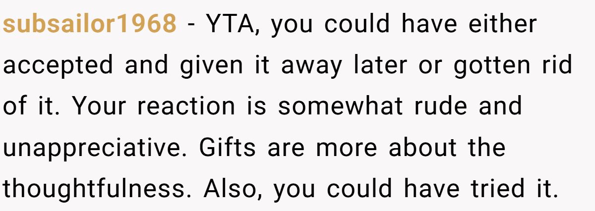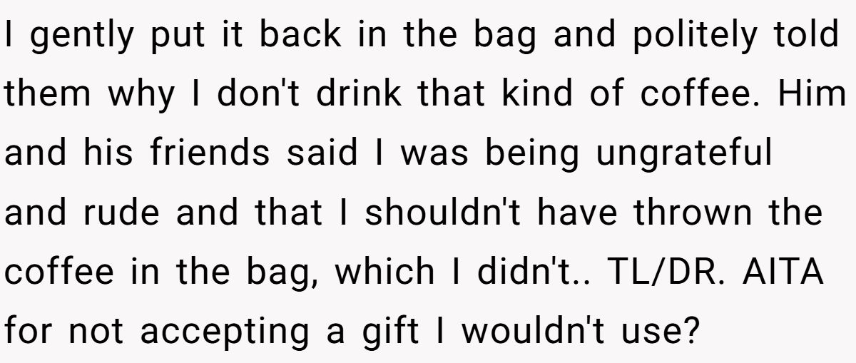 Still, there’s a line between honest and harsh. The Redditor claims he didn’t “throw” the coffee in the bag, but even the smallest gesture can be interpreted as rude if emotions are already running high. One alternative? Accept the gift, thank them, and privately choose not to use it—classic social grace.