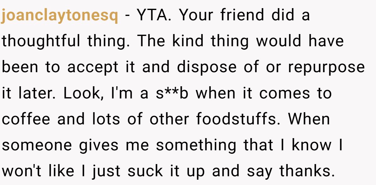 Commenters stressed that gifts are about thoughtfulness, urging him to say thanks and repurpose the coffee rather than reject it outright