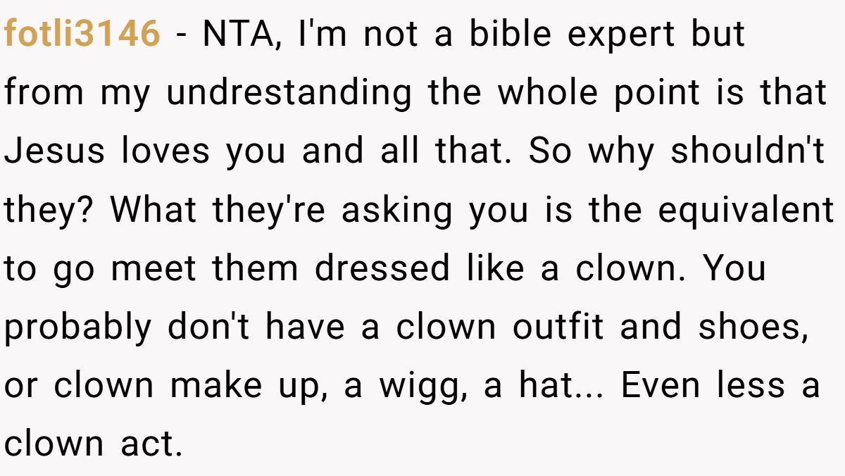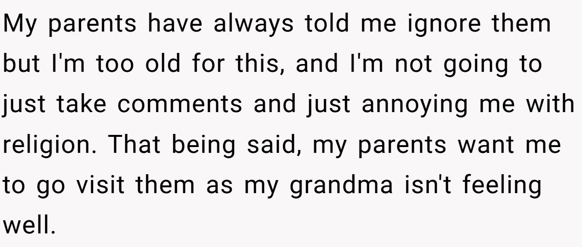 After years of enduring syrupy sermons about hell and repentance, this Redditor has finally drawn a line: no wardrobe change, no visit. With their grandma’s health declining, their refusal has sent shockwaves through the family. Are they wrong for standing their ground, or is this a much-needed act of self-respect?