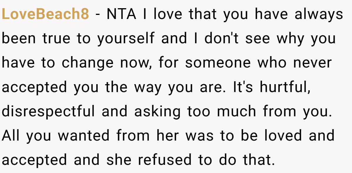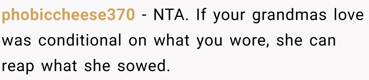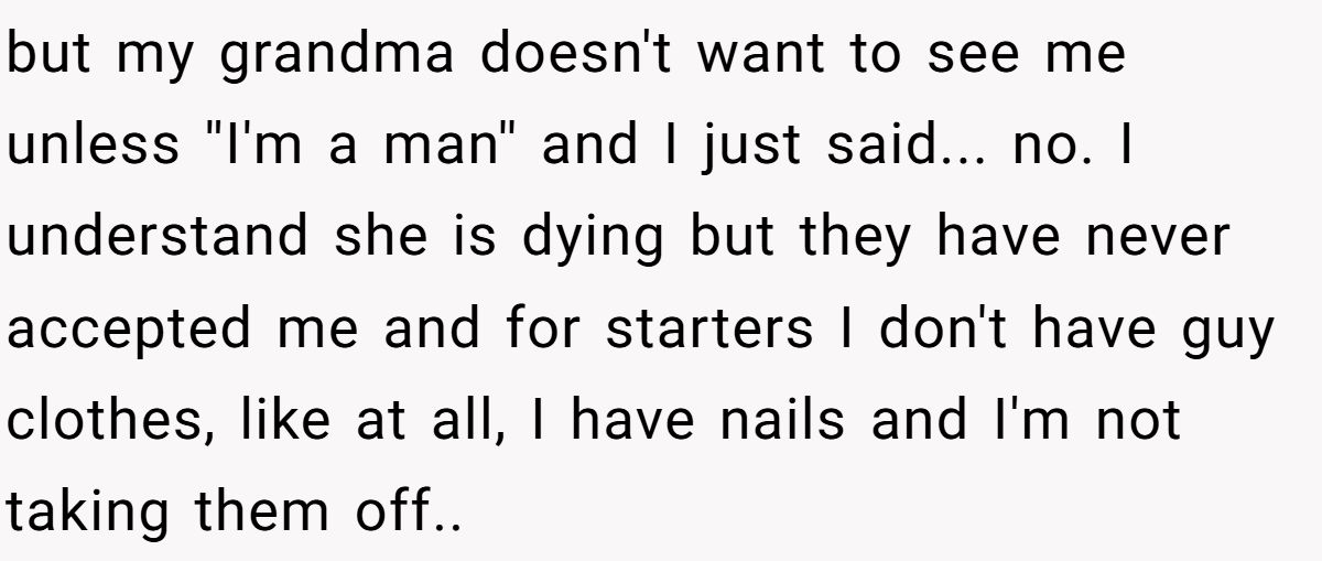 This Redditor’s choice to stay true to themselves, heels, makeup, and all, has left their family grappling with anger, sadness, and regret. Some say it’s too harsh to skip a final visit over clothes. Others believe it’s the only way to protect their hard-won self-worth.