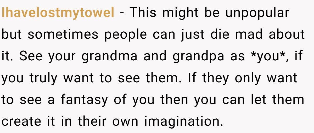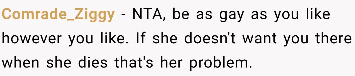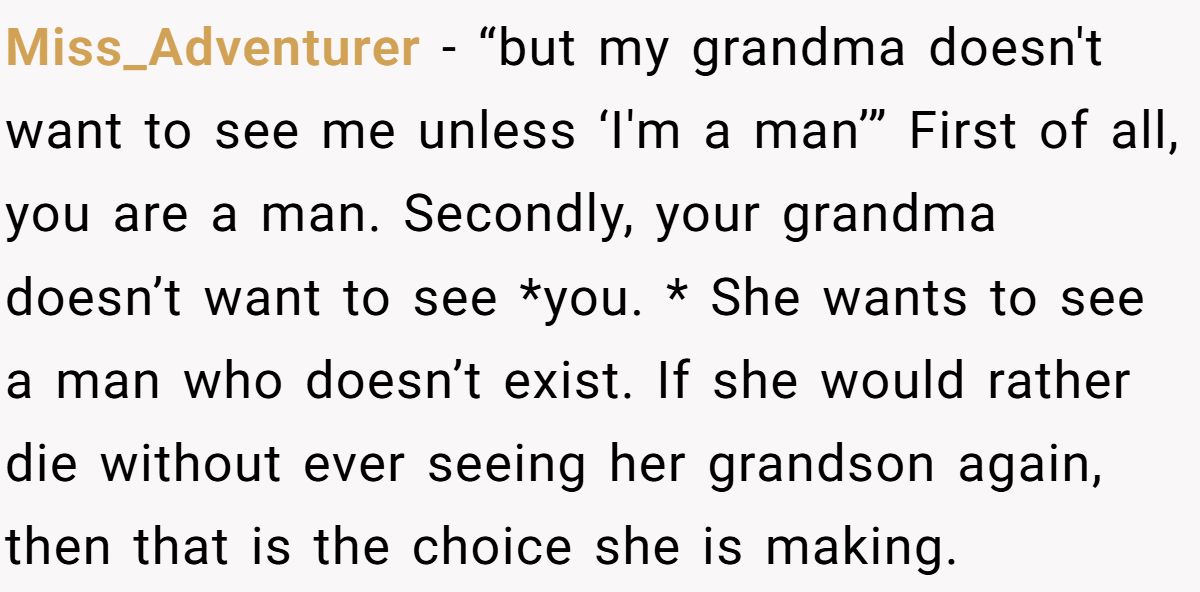 It’s easy to see why some in the family think they should compromise “just this once.” Grandma is unwell, and this might be the last chance to reconnect. But for the Redditor, that connection comes at the price of hiding who they are, something they’ve spent years fighting to embrace.
