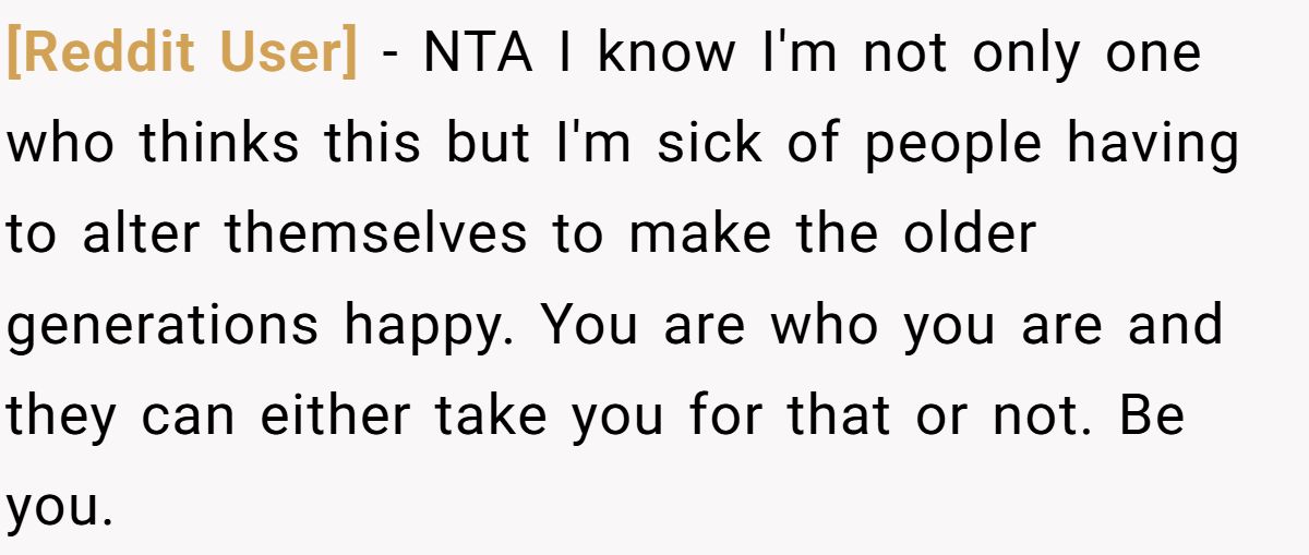 ![He Refused to Change for His Grandparents - Now the Family’s in Chaos! [Reddit User] − NTA I know I'm not only one who thinks this but I'm sick of people having to alter themselves to make the older generations happy. You are who you are and they can either take you for that or not. Be you.](https://dailyhighlight.com/wp-content/uploads/2025/07/A26705-11.jpg)