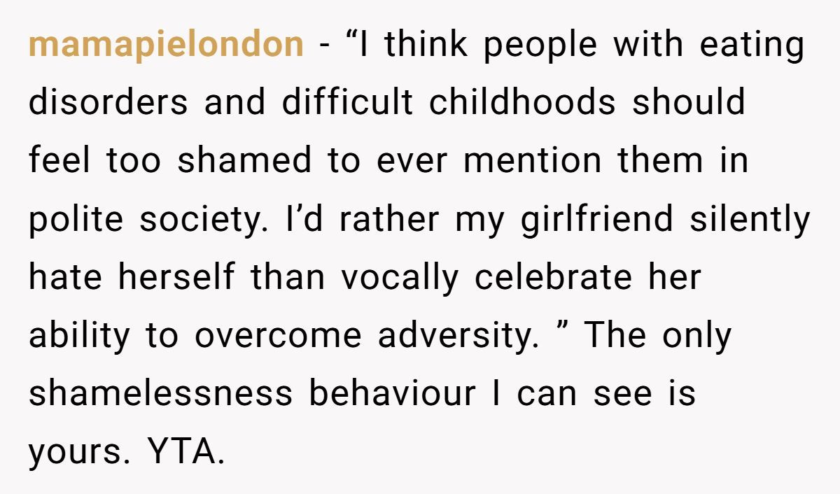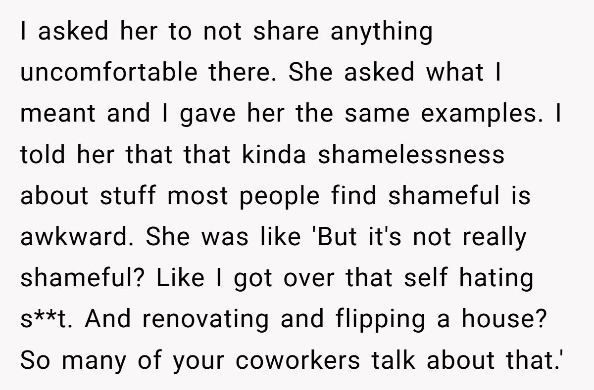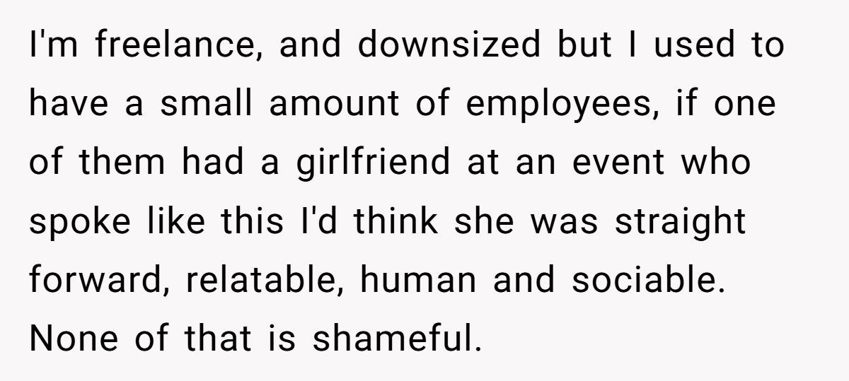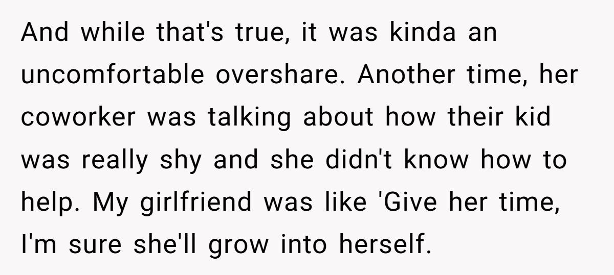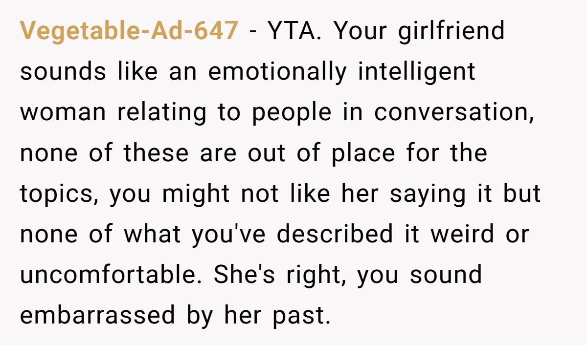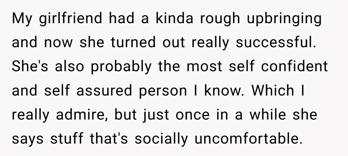 But his girlfriend’s confidence isn’t a flaw; it’s a superpower. Her stories of overcoming adversity connect with others, as seen when she reassured a coworker about their shy kid. By framing her past as “shameful,” he’s inadvertently dismissing her strength, which stings—especially since she’s worked hard to shed self-doubt.