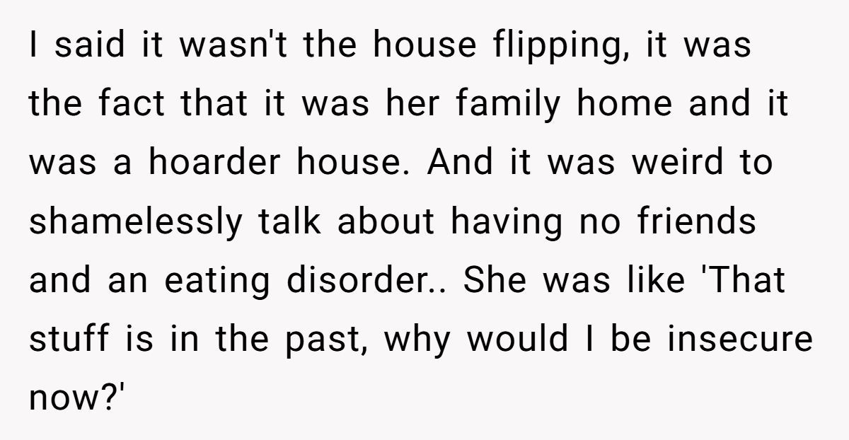 She’s a self-made success, flipping houses and snagging promotions, yet he’s sweating over her candid tales stealing the spotlight. From her perspective, she’s not airing dirty laundry; she’s celebrating resilience. He sees awkward silences; she sees relatable authenticity. It’s a classic clash of social comfort zones, where his caution meets her fearless transparency.
