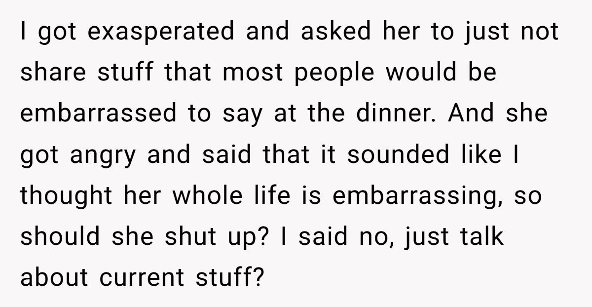 One Redditor’s in a pickle after asking his wildly successful girlfriend to tone down her unfiltered stories at a high-stakes company dinner. Her confidence is magnetic, but her oversharing? A bit like serving spicy chili at a potluck: bold, but not everyone’s ready for the heat.