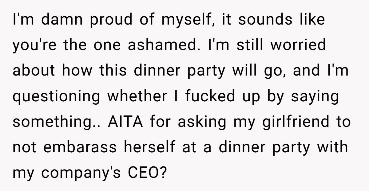 Meeting the CEO for dinner can feel like auditioning for a role in a corporate sitcom, but this Redditor’s request for his girlfriend to “keep it chill” sparked a firestorm. The issue? His girlfriend’s unapologetic openness about her tough upbringing—think hoarder houses and eating disorder recovery—clashes with his vision of polished dinner-party banter.