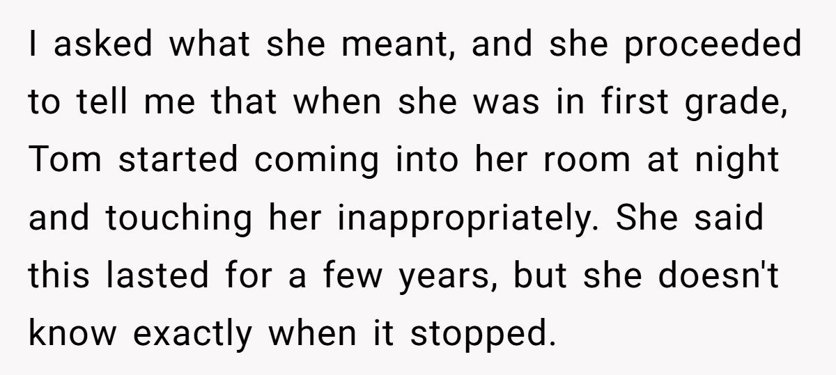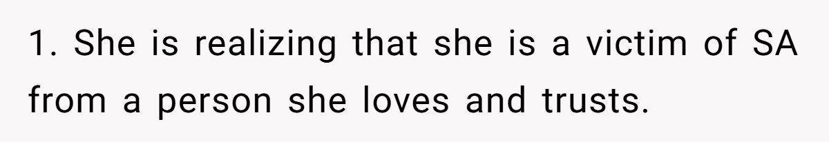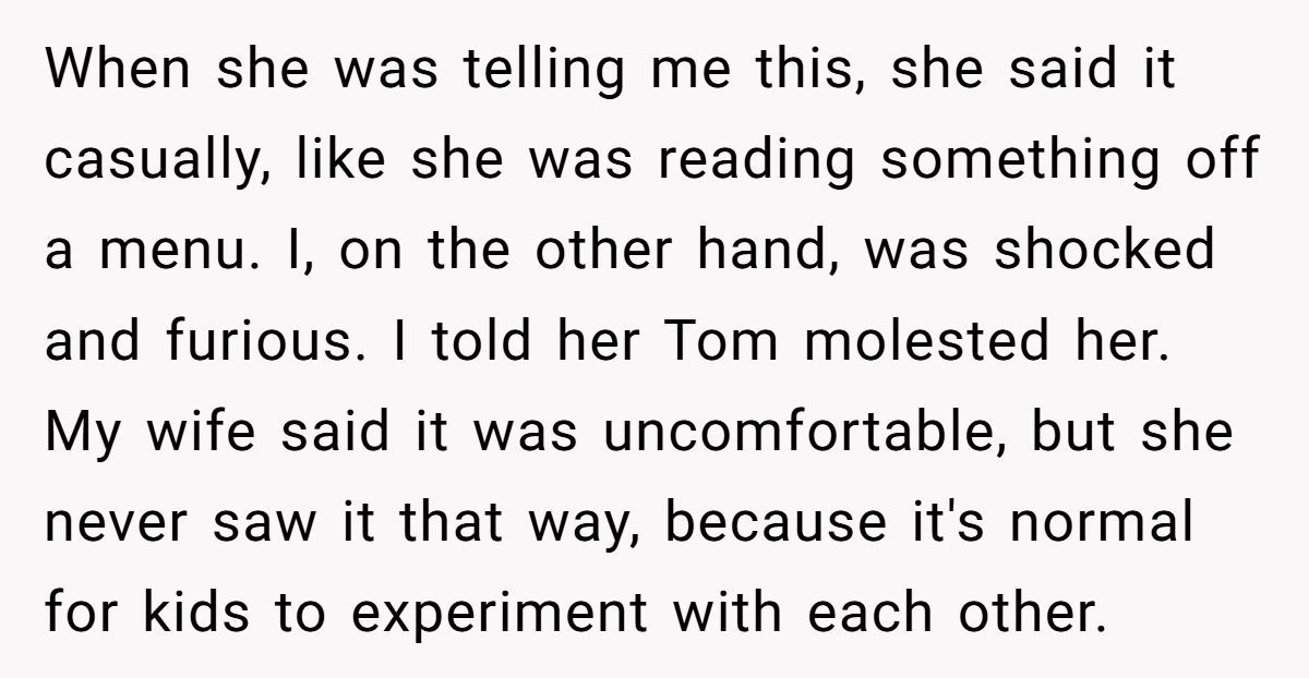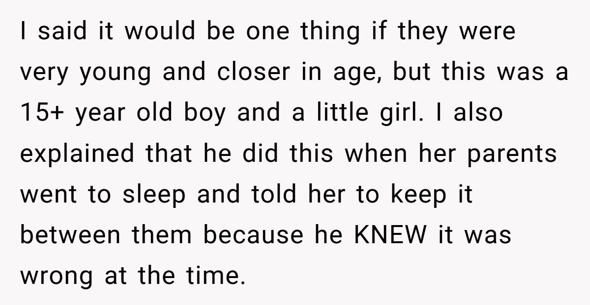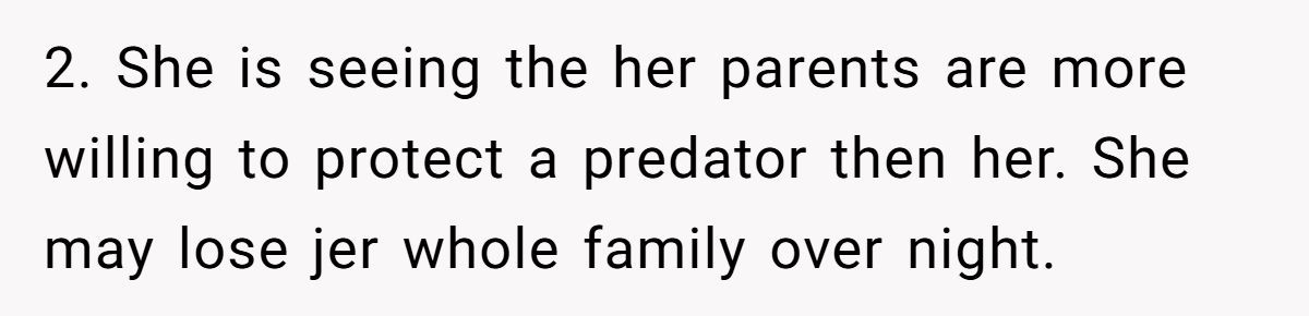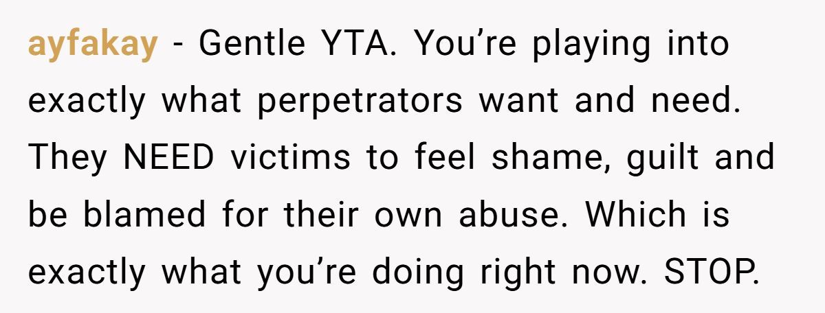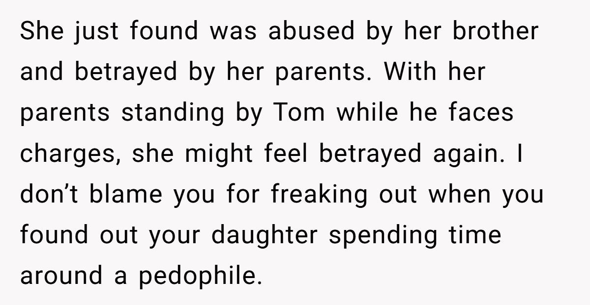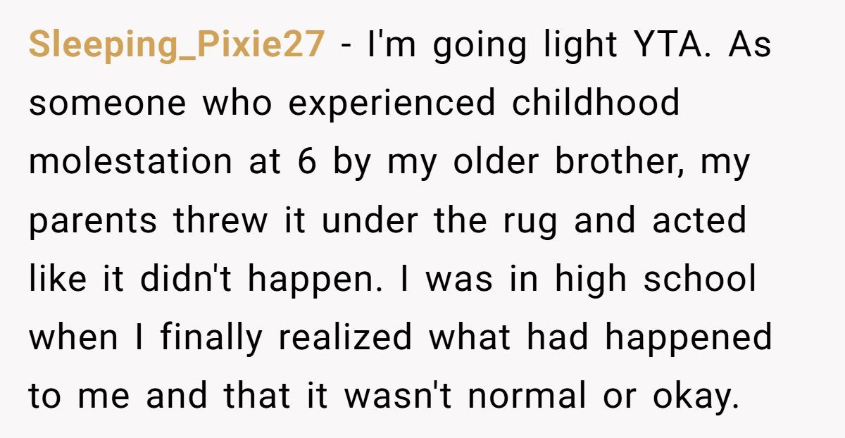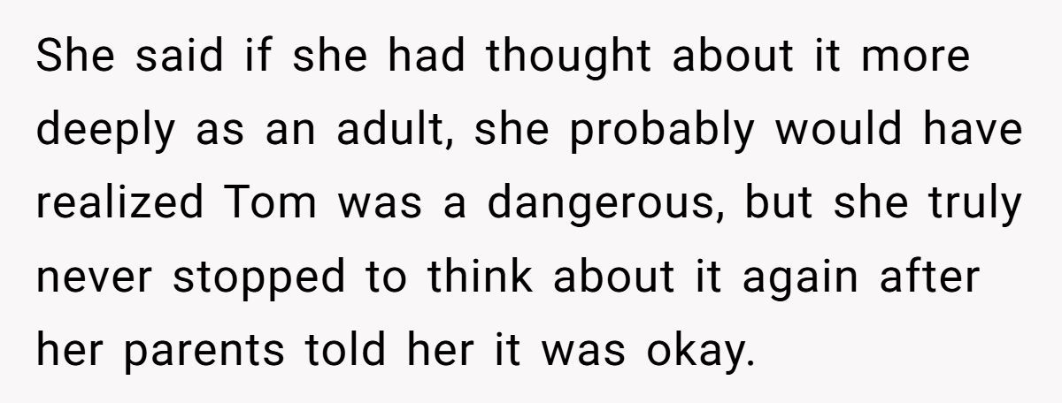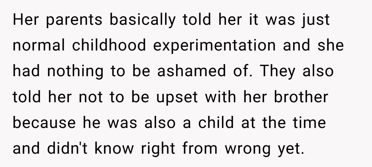 She told her parents about the abuse at the time, but they brushed it off as “normal childhood experimentation.” They never protected her, never addressed the trauma, and continued to treat her brother as if nothing had happened.
