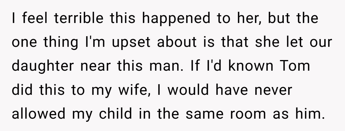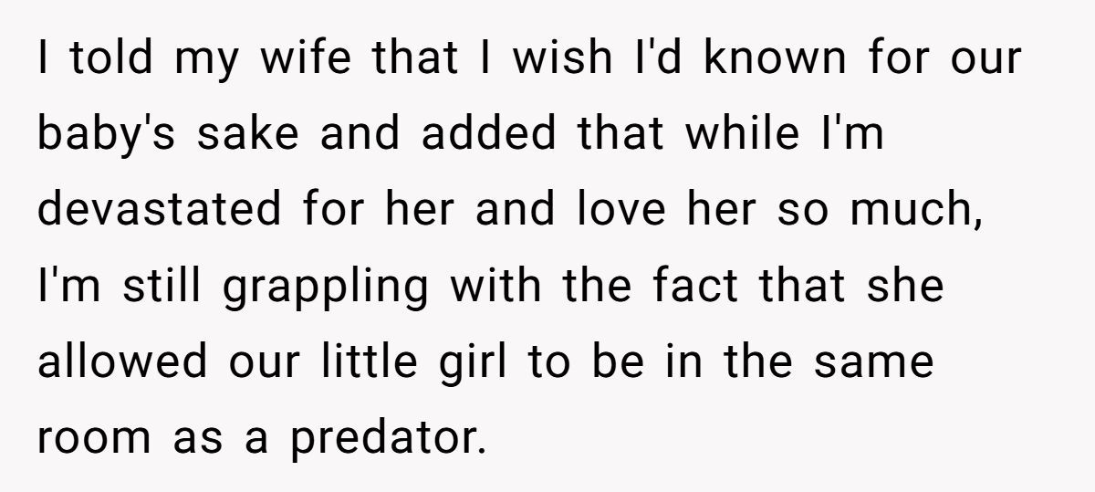 The husband was devastated. His first thought was, “How could you let our daughter near this man?” He accused his wife of putting their child in danger. In her vulnerable, unraveling state, his words shattered her. She cried uncontrollably, haunted by both her past and the present fear of what might have happened.