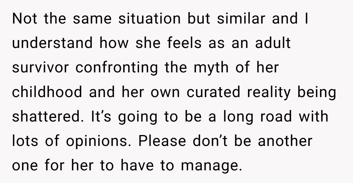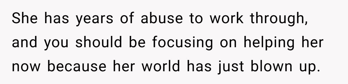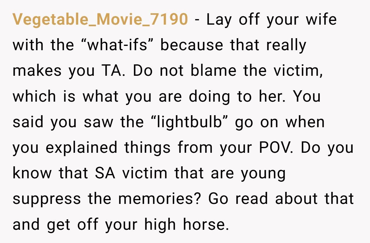 While the husband’s anger is valid, so is the need for compassion. Blaming a trauma survivor in the moment of their awakening risks compounding their pain. Instead of shame, what she needs most is support, understanding, and professional help.