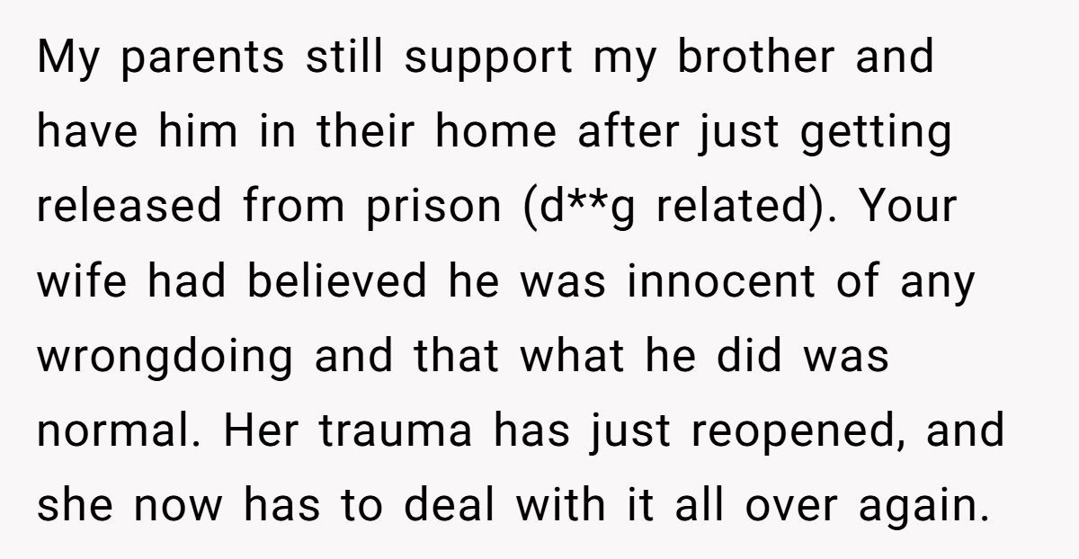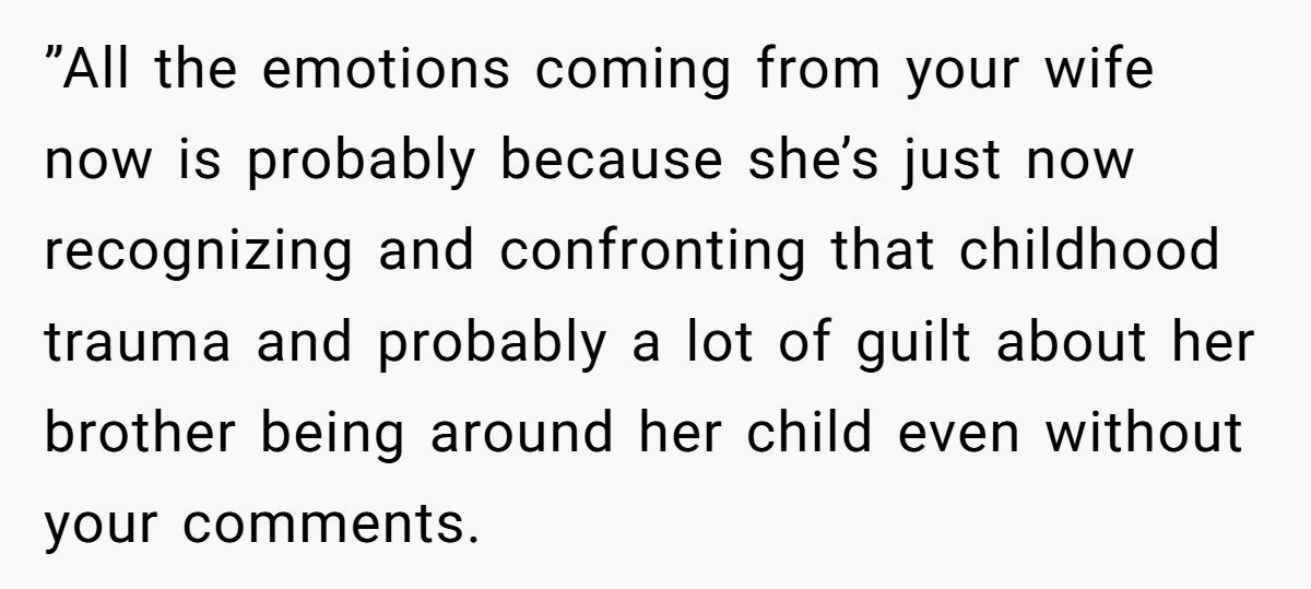 The wife’s belief that her brother was no longer a threat wasn’t rooted in negligence. It was shaped by years of denial and emotional survival. Her grief and guilt now come not only from her childhood but from the sudden realization that she may have unknowingly repeated a cycle of danger.