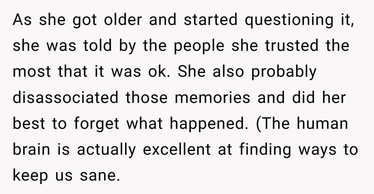 Trauma specialist Dr. Bessel van der Kolk explains that survivors often suppress their abuse to survive. When their pain is dismissed by trusted adults, they may learn to see the abuse as “normal” or “not a big deal.” That seems to be exactly what happened in this case.