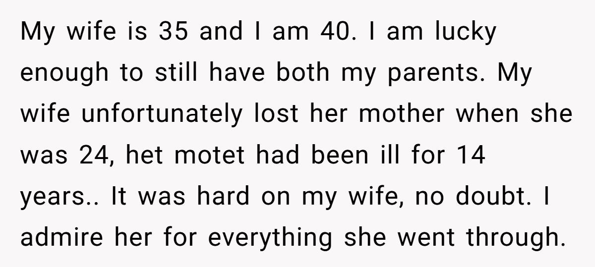 And then there’s the timing. The wife lost her mother before marriage, before motherhood, before many of the life events where a parent’s presence matters deeply. Her grief isn’t just about the past—it’s about everything her mom will never see.