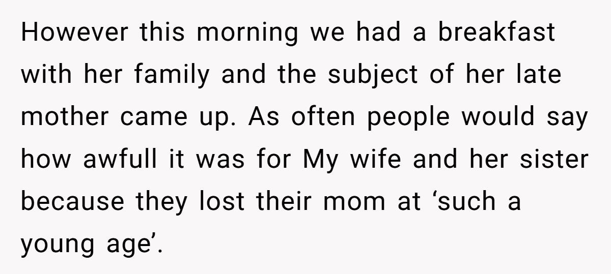 The couple was having breakfast with the wife’s father and sister when her late mother came up in conversation. A passing comment about how young she was when she lost her mom prompted her husband to chime in.