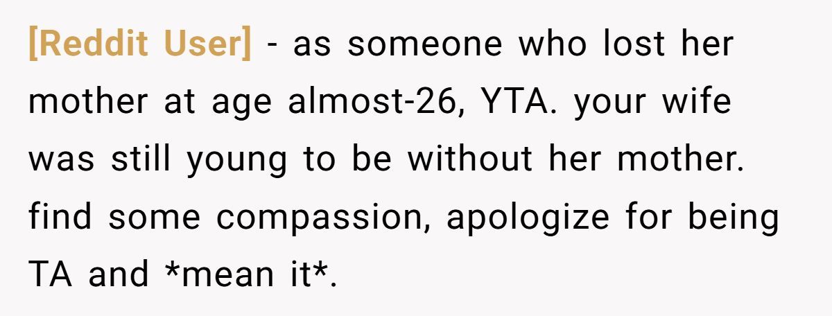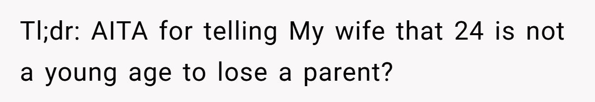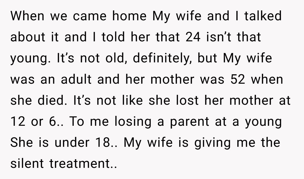 At the center of this drama is a Redditor who, during casual conversation with his in-laws, declared that losing a parent at 24 “wasn’t that young.” His wife, now 35, was stunned into silence. And she’s stayed that way since.