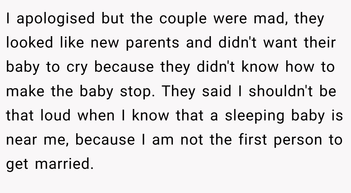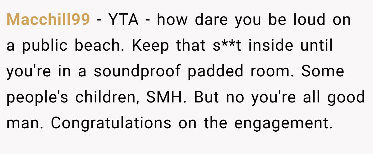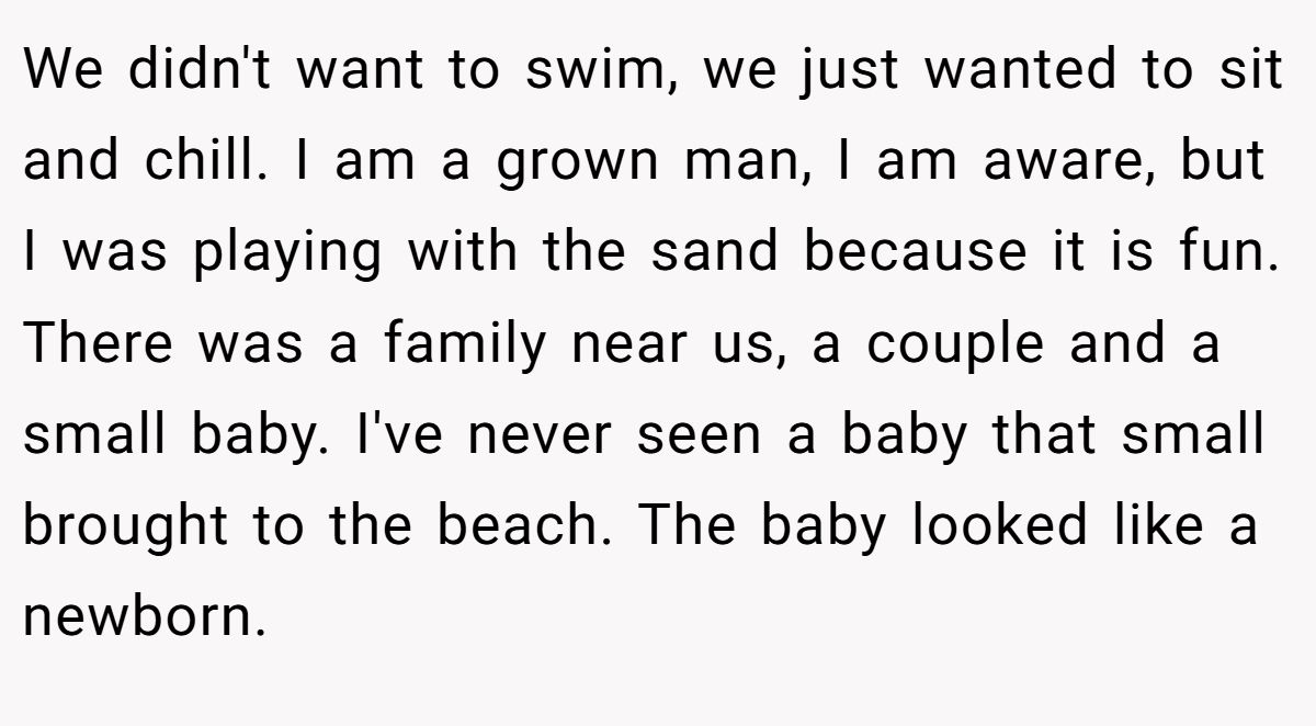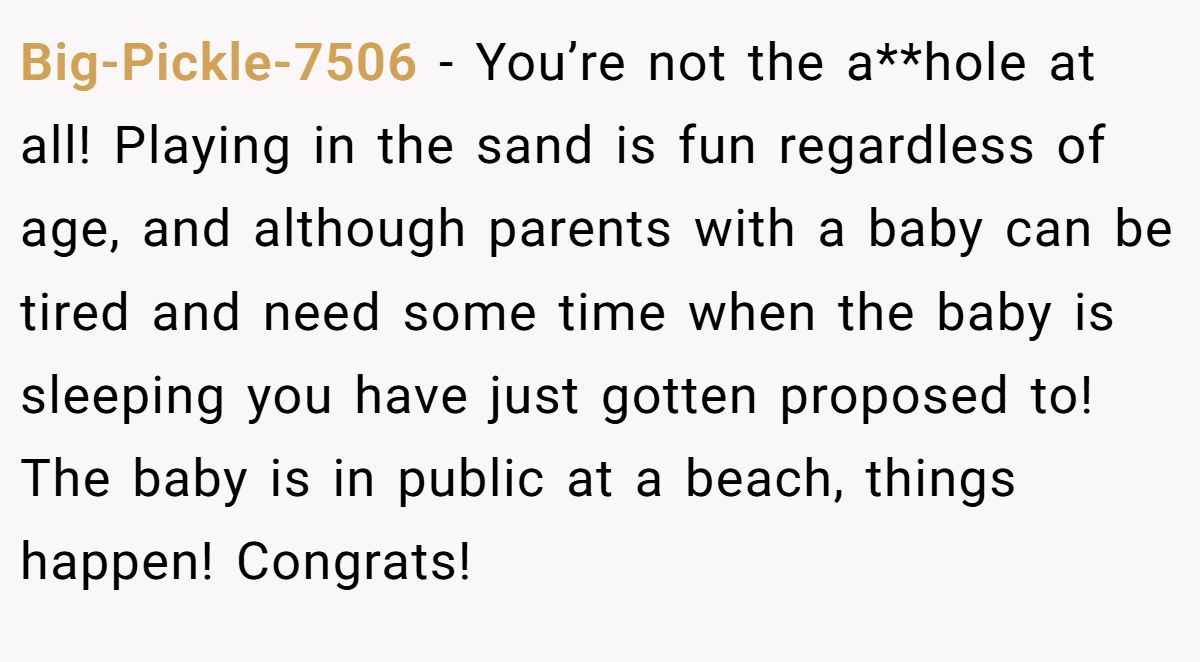 Could this have been smoother? A softer apology might’ve de-escalated, but the parents’ scolding was disproportionate. Neutral advice? The Redditor should let it go, focus on his engagement, and maybe offer a friendly nod if he sees the family again. The parents could benefit from choosing quieter spots for naps. What do you think—joyful outburst or beach blunder?