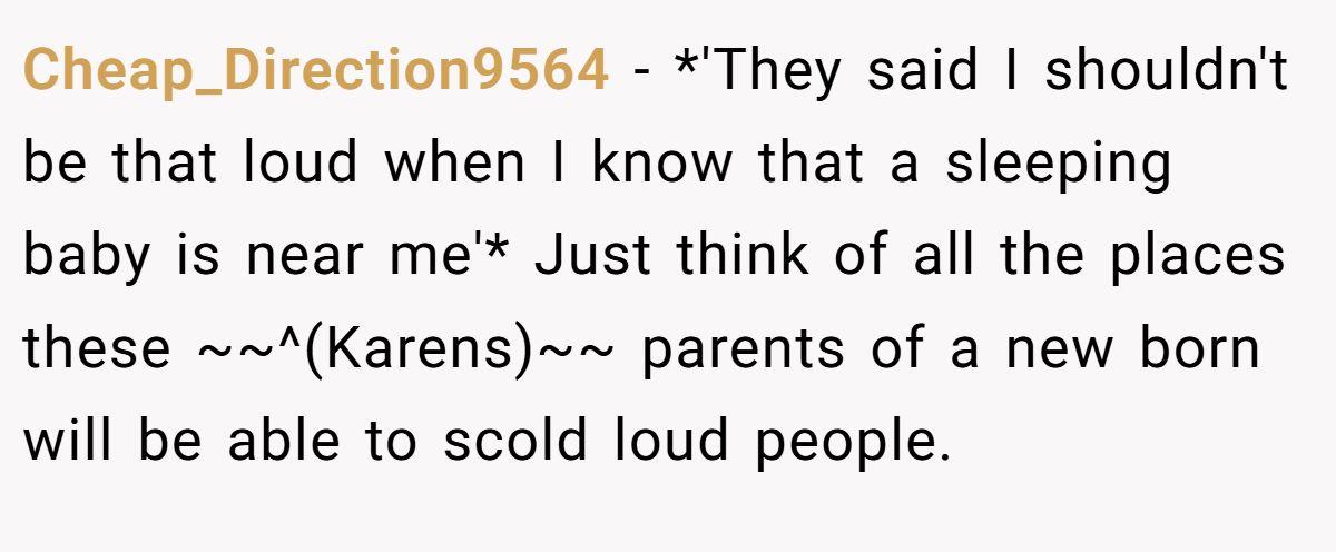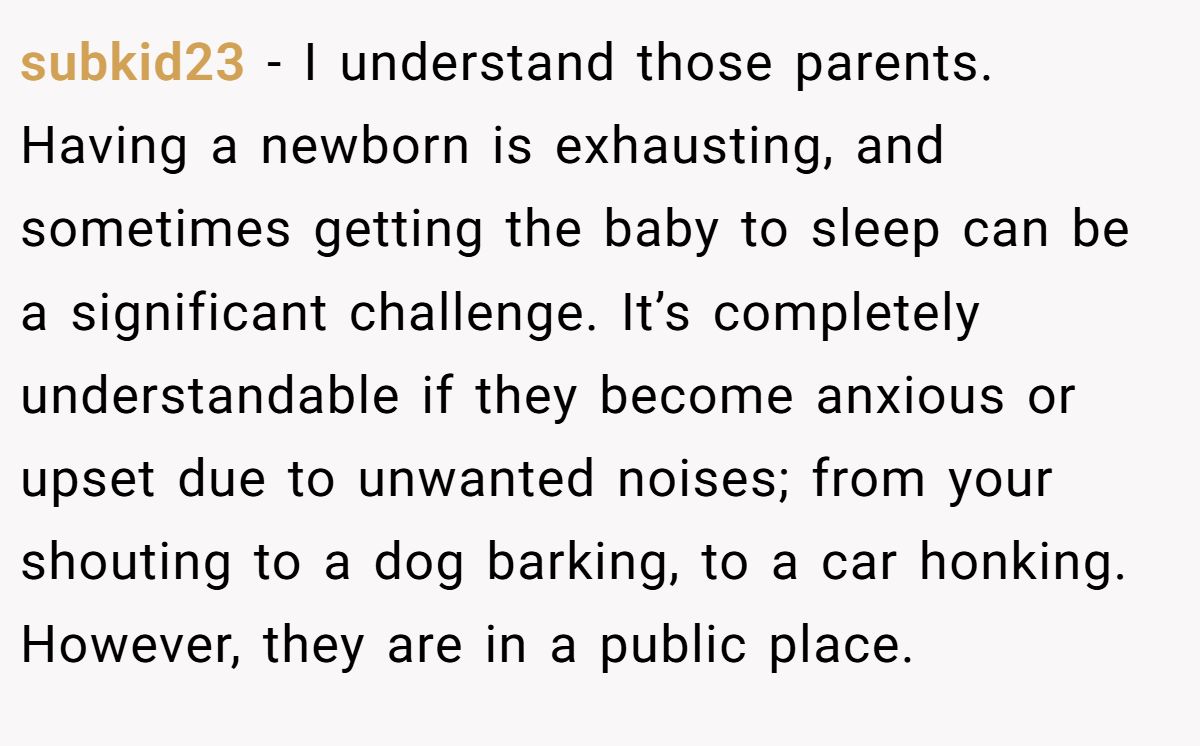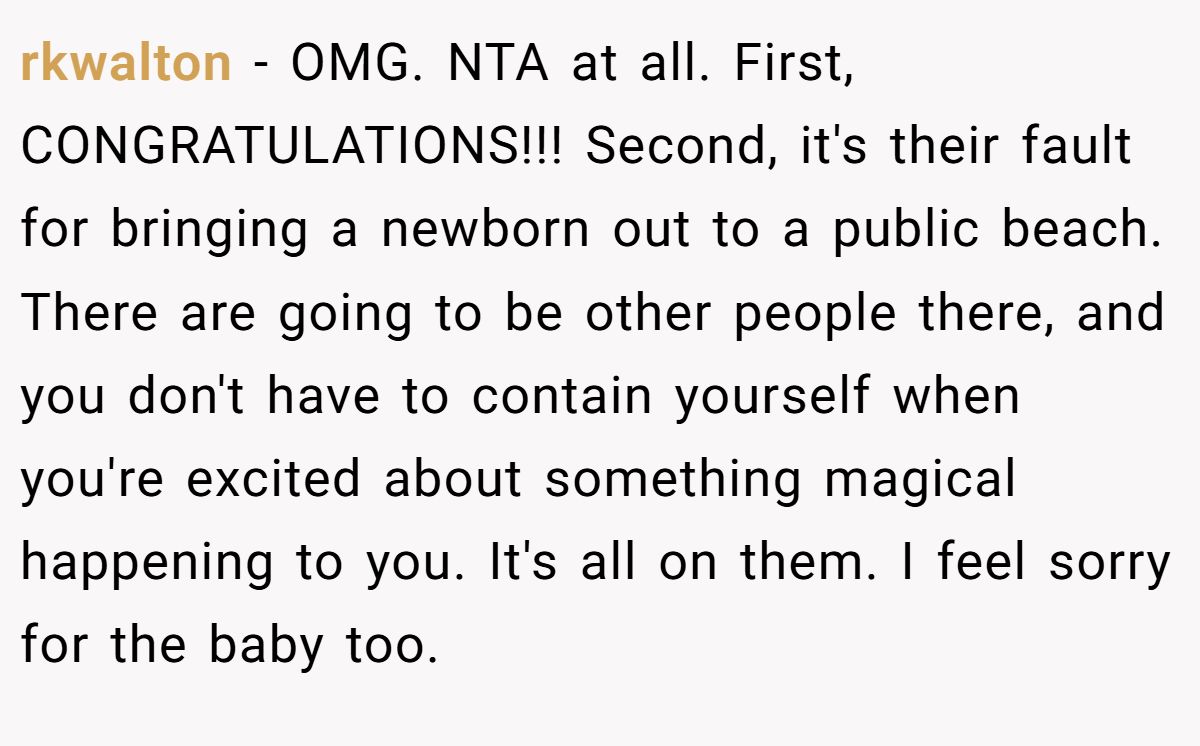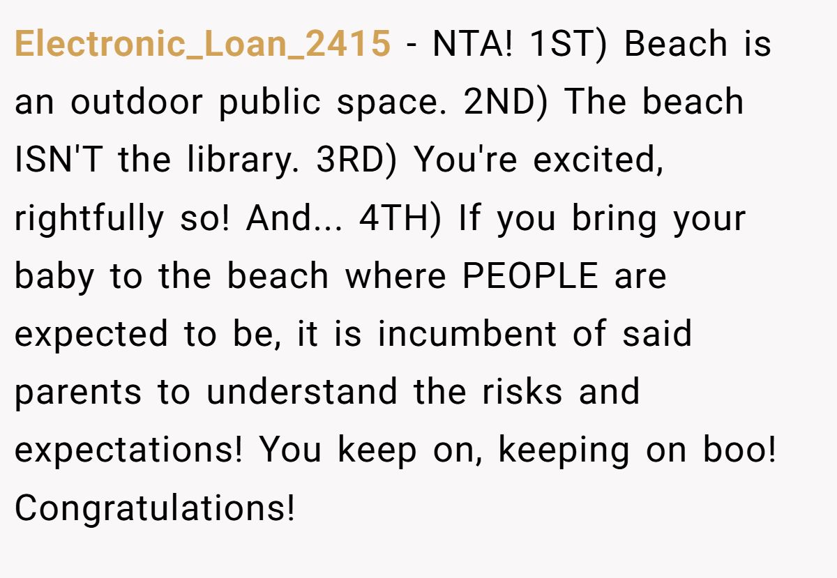 Public spaces demand mutual respect, not control. Dr. Jane Adams, a social psychologist, notes in a 2023 Psychology Today article, “Public settings require tolerance for others’ behaviors within reason”. The Redditor’s outburst, while loud, was a natural reaction to a life-changing moment. The parents’ expectation of silence on a beach, where noise is common, seems unrealistic, especially with a newborn sensitive to disturbances.