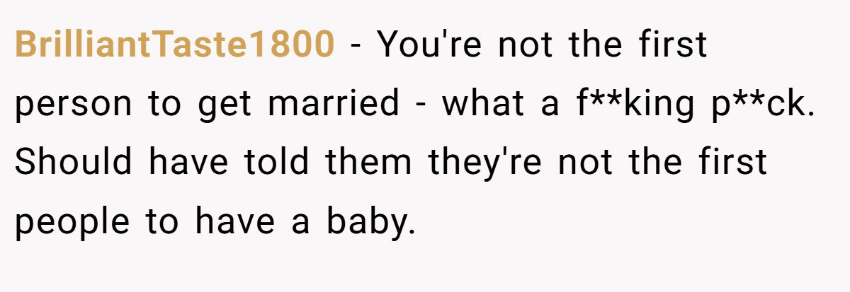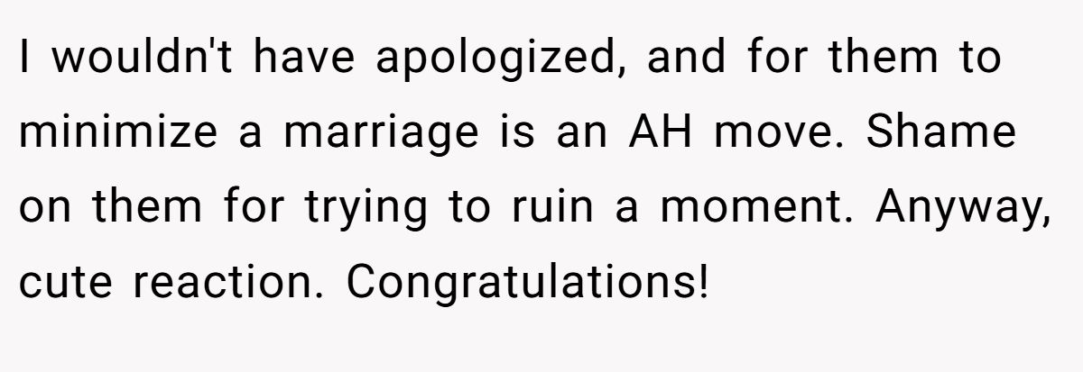 BrilliantTaste1800 mocked the parents’ minimization of marriage, siding with the Redditor.