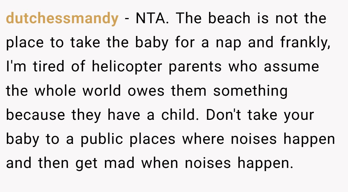 Cheap_Direction9564 called out the parents’ unrealistic expectation of quiet on a beach.