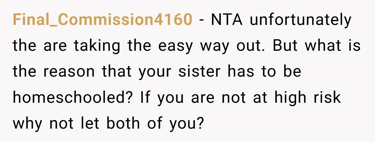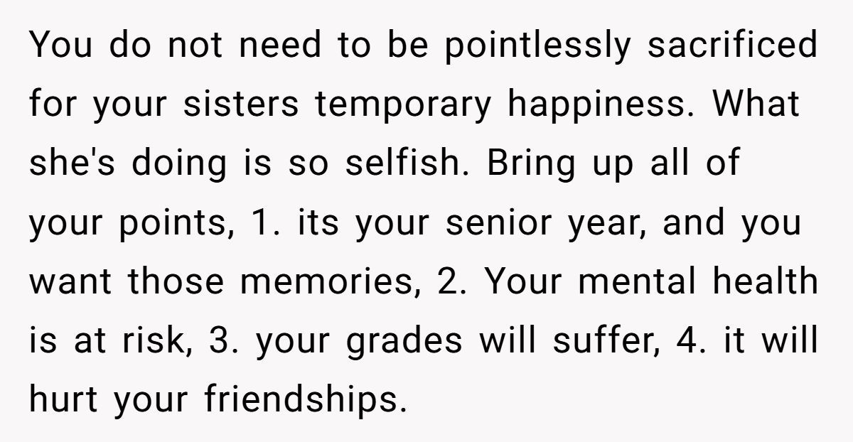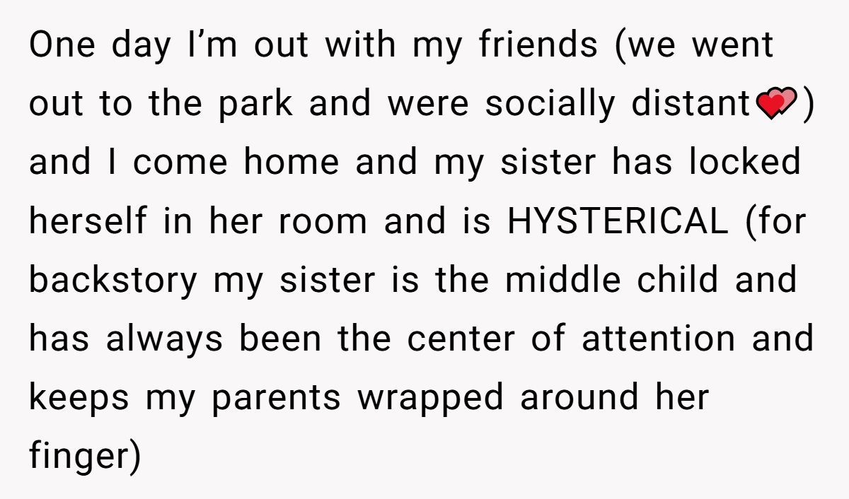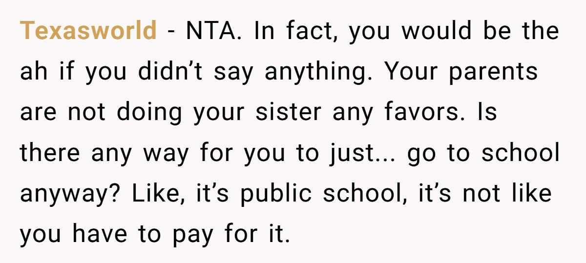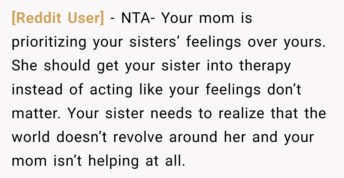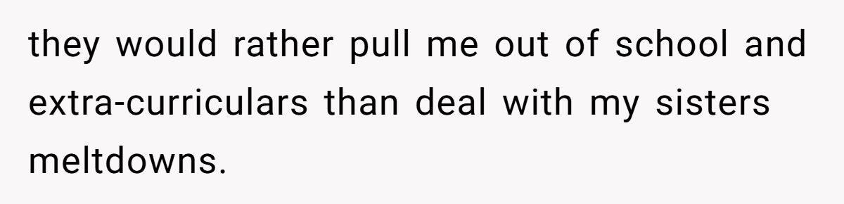 From the Redditor’s perspective, this isn’t about school—it’s about being sidelined. She’s being punished for being stable, reliable, and quiet, while her sister’s emotional outbursts dominate every decision.