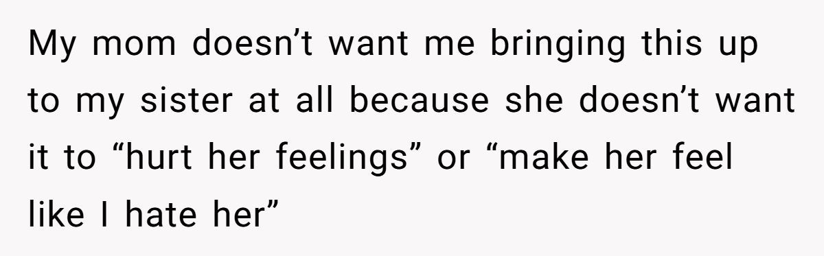 Worse, they asked her to keep the real reason a secret—to protect her sister’s feelings. Now she’s stuck between rage and heartbreak, wondering: Is she wrong for wanting to call it out? Or is this a clear case of one child being sacrificed for another’s comfort?