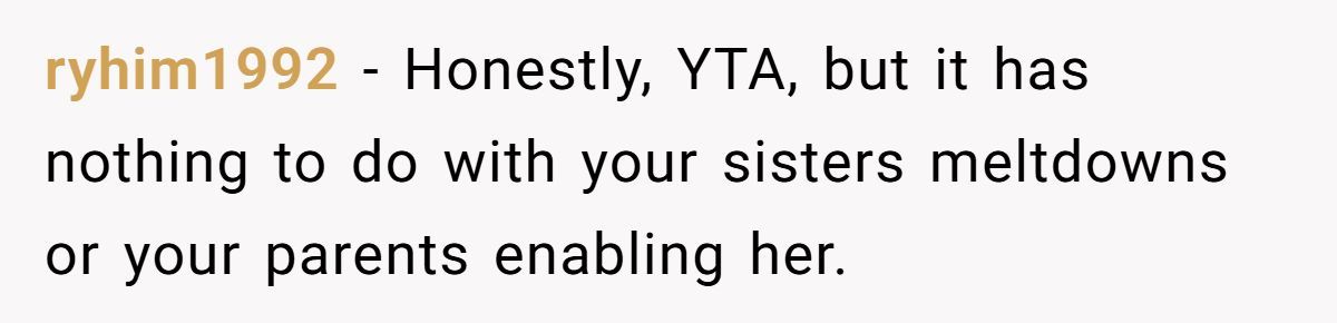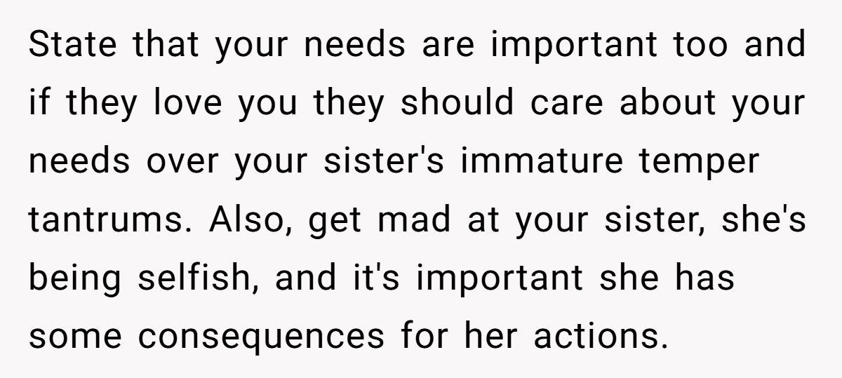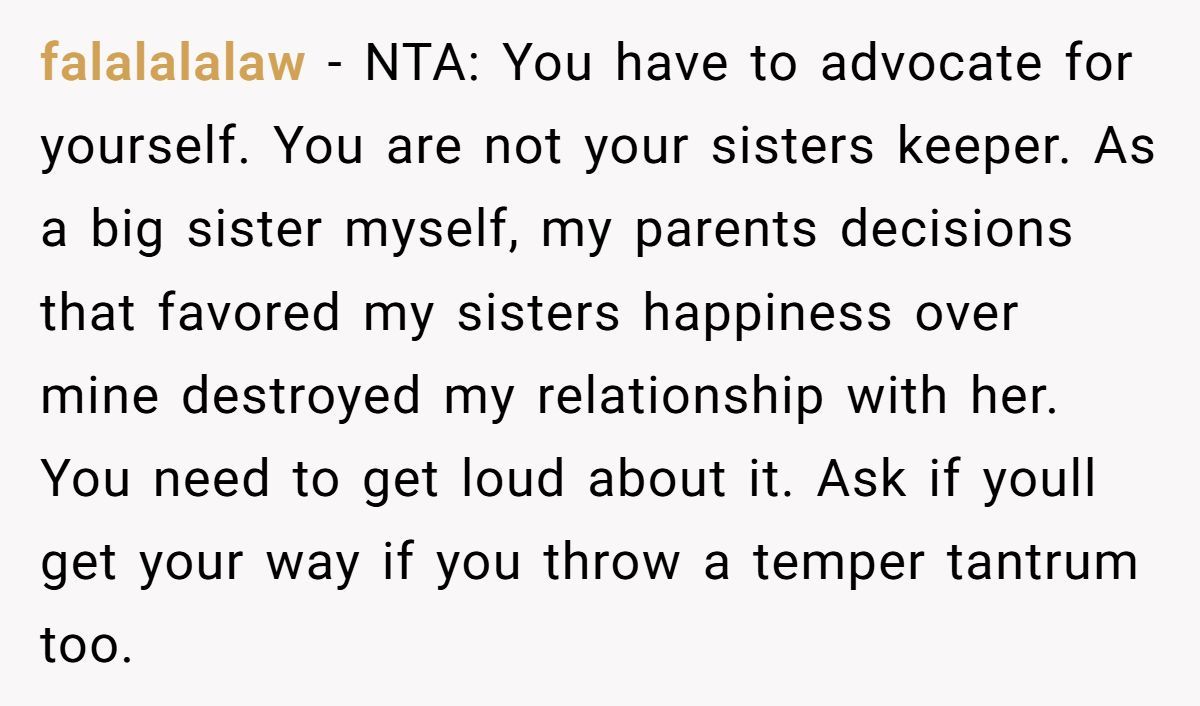 Commenters were split—some strongly backed the OP, saying her parents were unfairly sacrificing her needs for her sister’s tantrums.