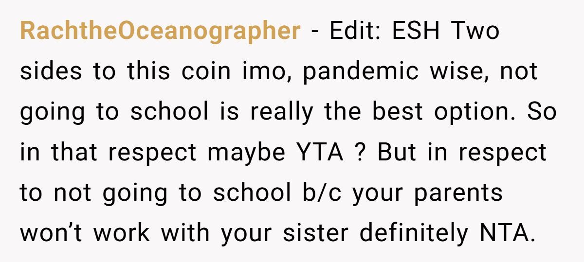 “My mom told me we have to do online school because my sister refuses to go in person,” she wrote. “She said it’s easier if we’re both home and told me not to tell anyone why, because it would ‘hurt my sister’s feelings.’”