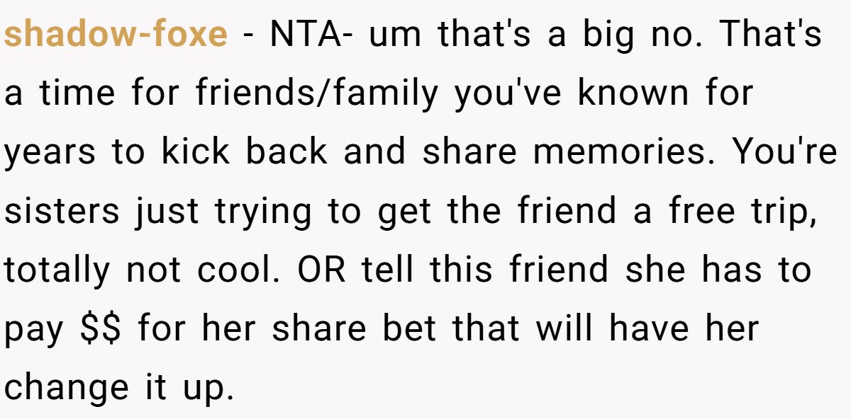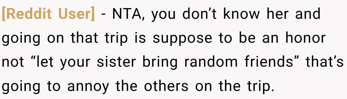 Others agreed you shouldn’t have to include a stranger on your special trip, and that your sister was overstepping by inviting someone without asking first.