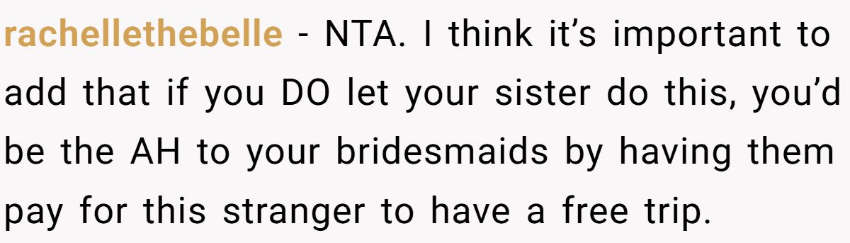Some people said your sister was out of line trying to bring someone you don’t know, and pointed out it could be unfair to your other bridesmaids to pay for a stranger.
