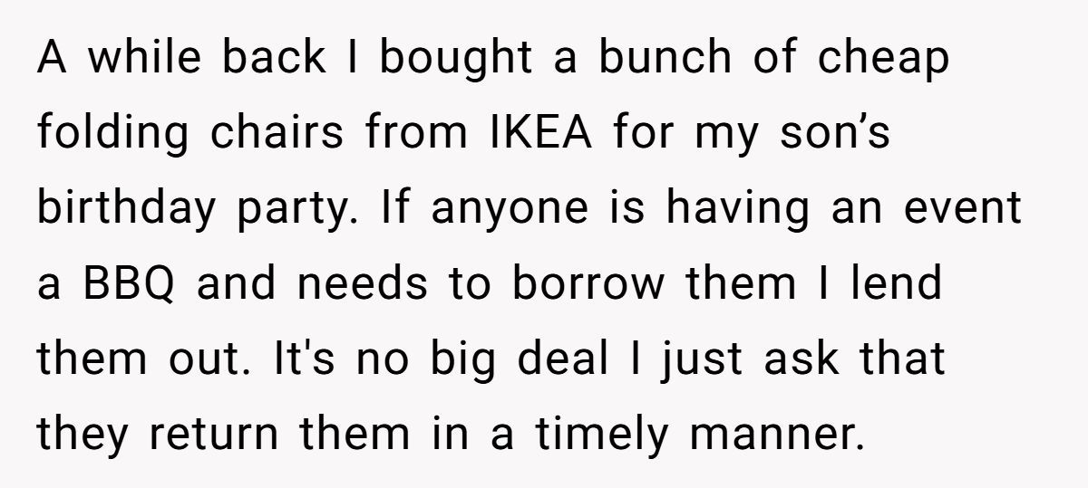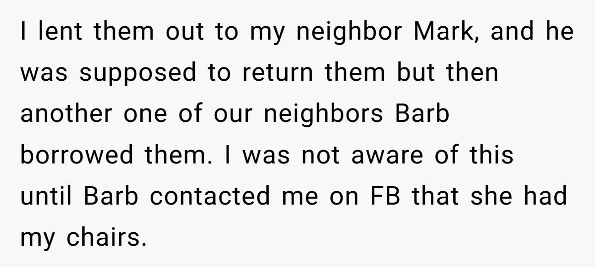 Talk about a neighborly favor folding faster than a cheap chair! This Redditor thought they were doing a solid by lending out their chairs, only to find their generosity used and abused. And the fact that Barb took the chairs without asking adds a whole new layer of audacity to the story.