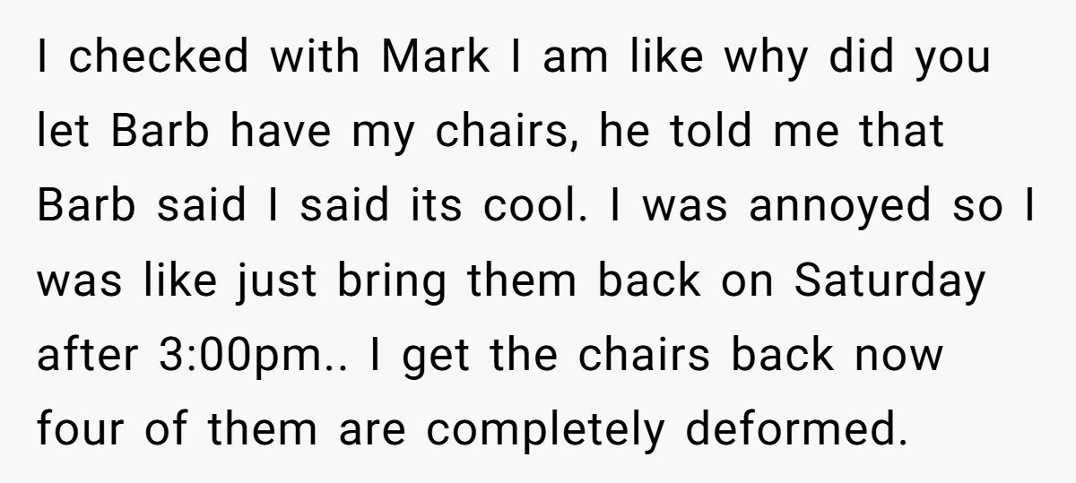 Instead, Barb helped herself while the Redditor was out of town and later returned the chairs “visibly damaged”—four of them bent or creased beyond use.