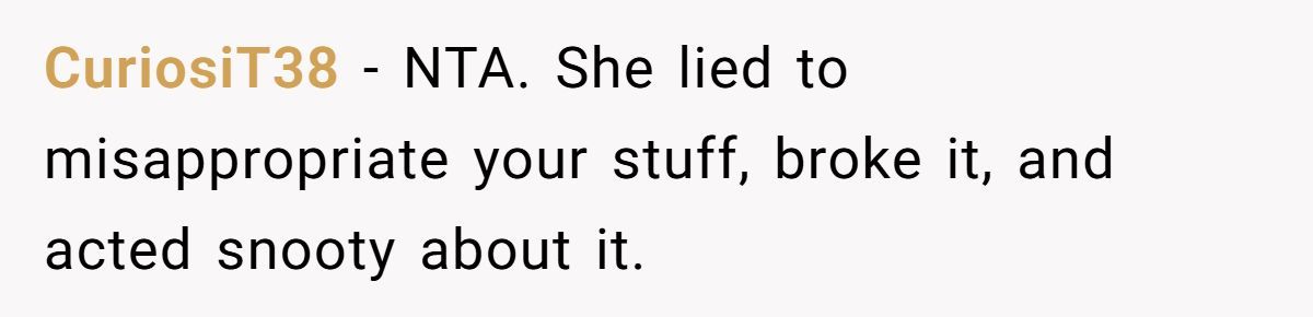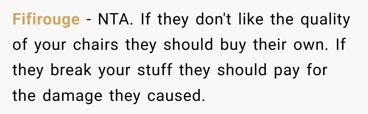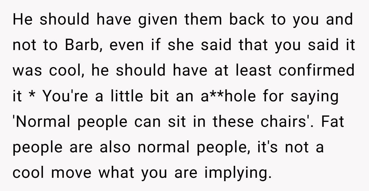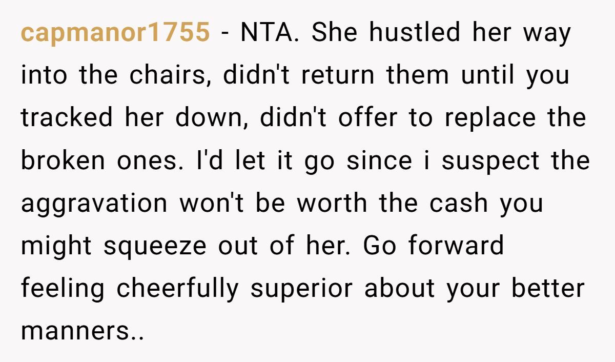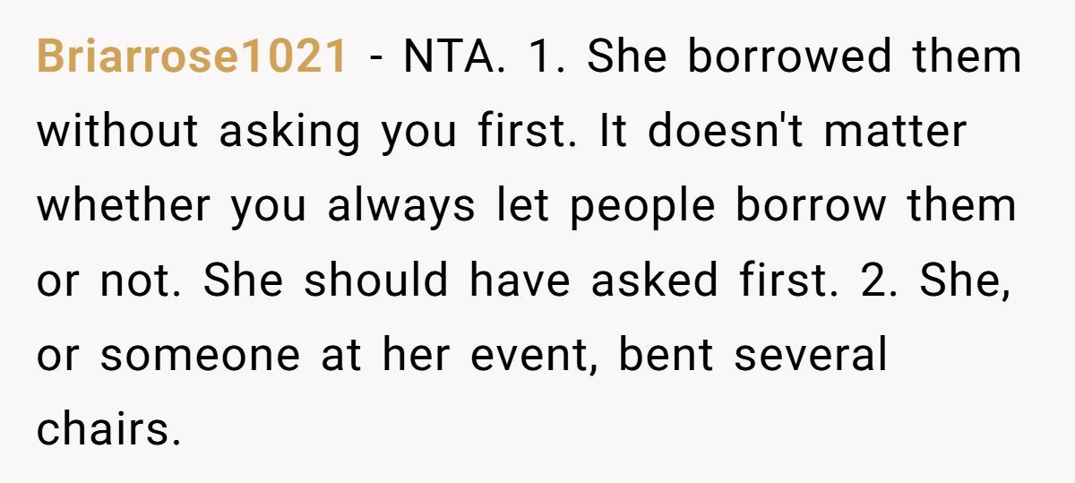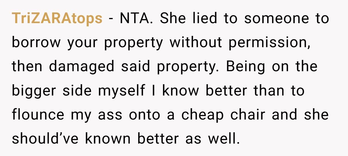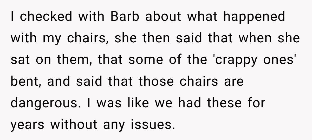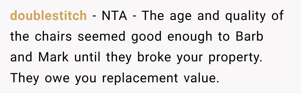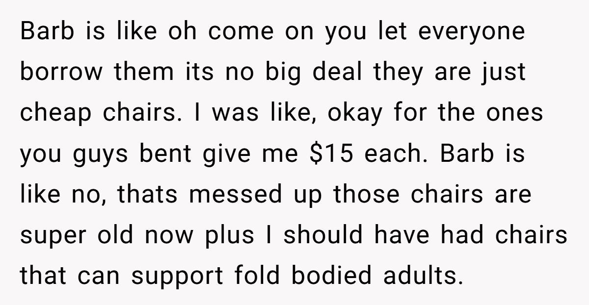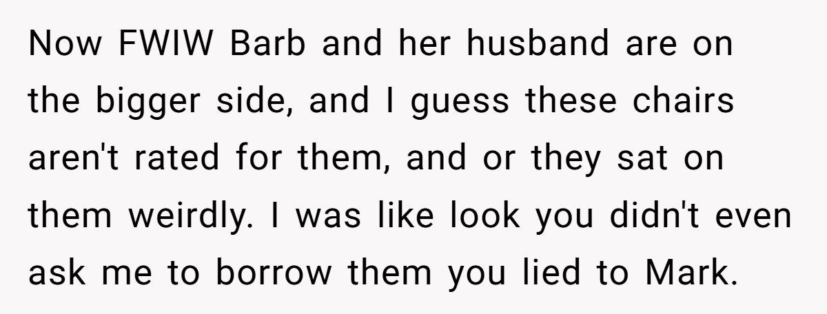 Some commenters agreed the original poster wasn’t the problem. Barb lied to borrow the chairs without permission, then broke them and tried to dodge responsibility.